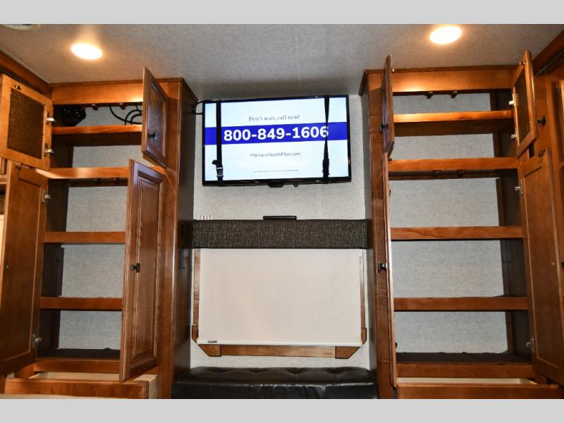 To the left of the entry door find a dinette for two, along with two recliners for relaxing and enjoying the entertainment center in the slide opposite. There is also a sofa with storage above including end tables that stretch across the rear of this coach.