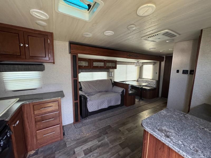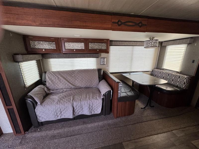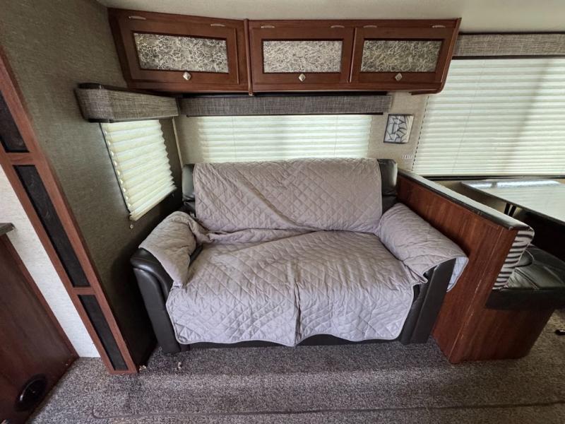 Along the rear wall there is a refrigerator, a three burner range where you can fix a quick snack or your favorite meals, and then easily clean up after your meal at the double sink. You will also find an overhead cabinet where you can store dishes or other items. The slide out features a sofa with an overhead cabinet, and a booth dinette.