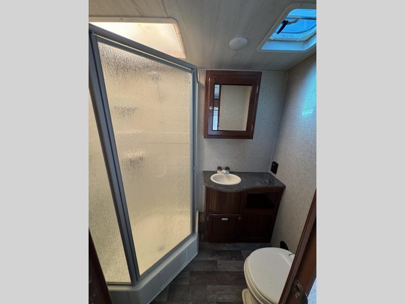 The side aisle bathroom features a toilet, sink, medicine cabinet, a corner shower, and a linen cabinet.