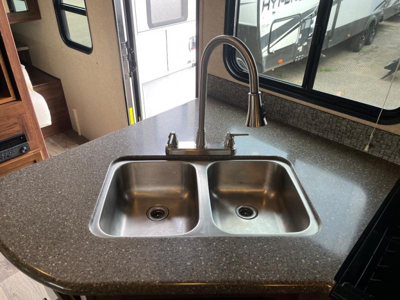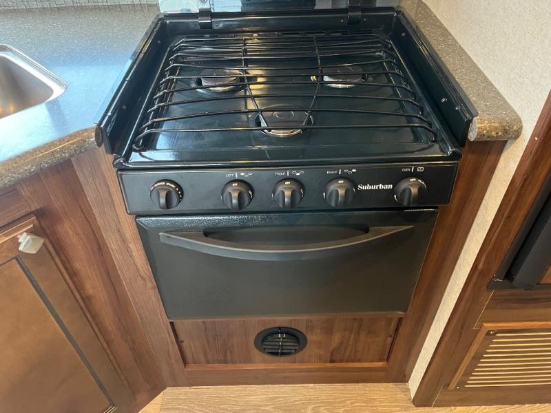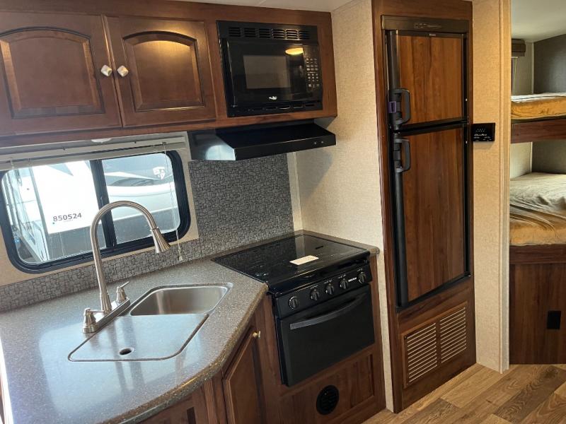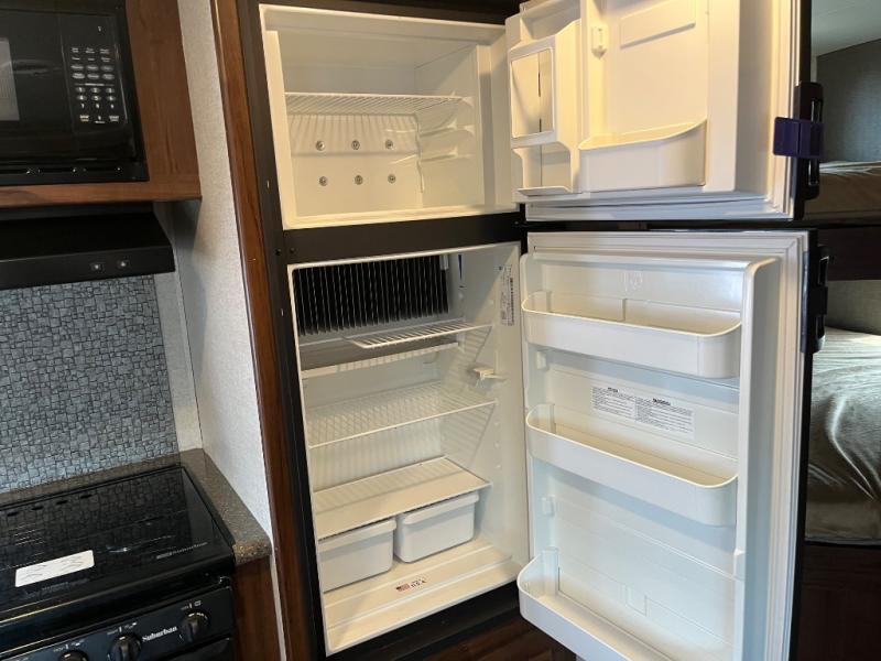 Head to the outside and find an added surprise with the outdoor camp kitchen beneath the bunks. There is a refrigerator, counter space, single sink, and a slide cook top, plus so much more to enjoy!