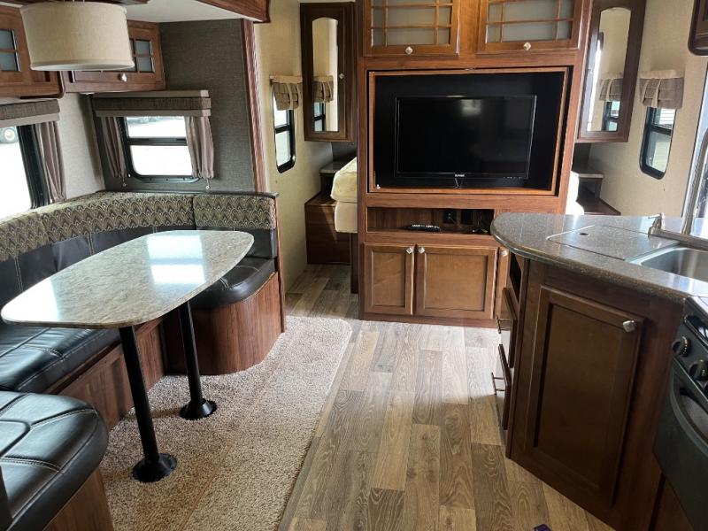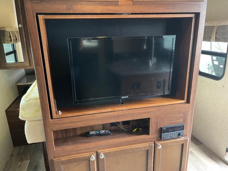 As you enter notice the entertainment center. The combined living room and kitchen provide a slide out u-shaped dinette for seating during meals and for just hanging out. This space also provides sleeping area for more family.
