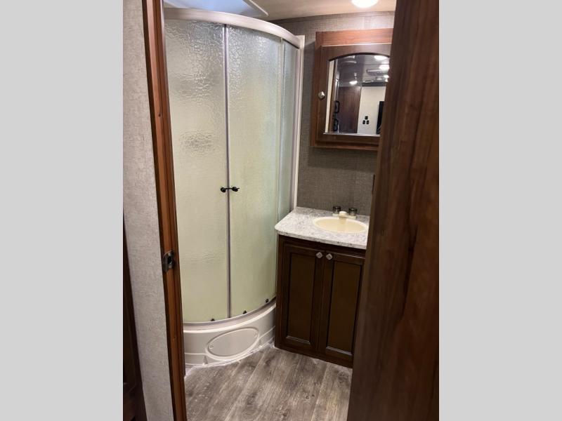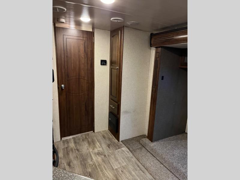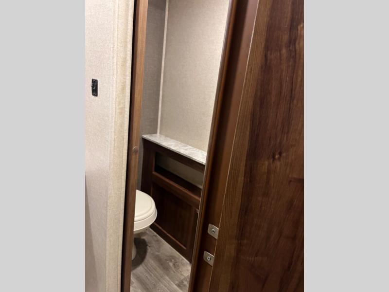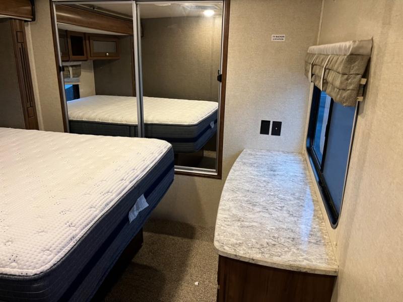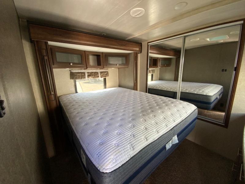 To the right of the entry door you will find a front bedroom including a slide out queen size bed. There is a dresser opposite along the curb side wall, and a large full front closet with sliding doors for your clothing.