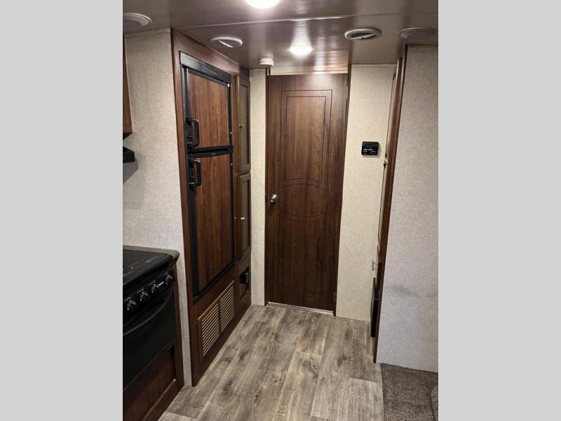 As you enter model 26BRLS you will find a combined kitchen and living area straight ahead. The kitchen is to your immediate left with a double sink set in an angled counter. There is a three burner range, refrigerator, and pantry for food storage needs. You will also find ample overhead storage for your daily dishes and other kitchen items.