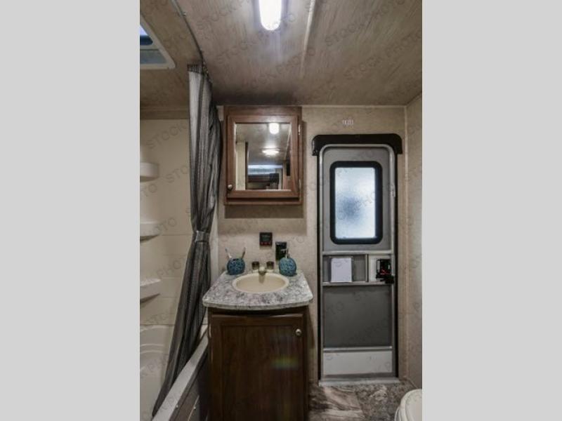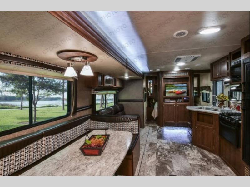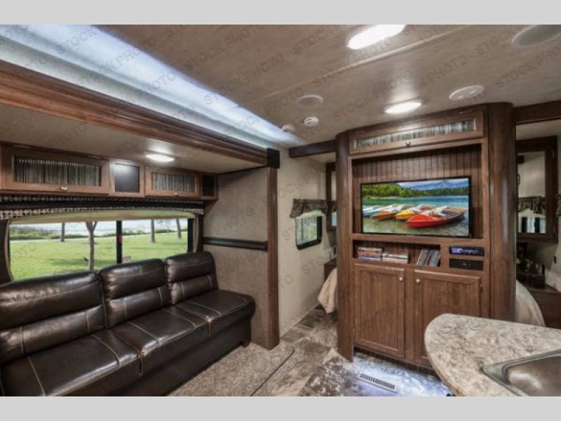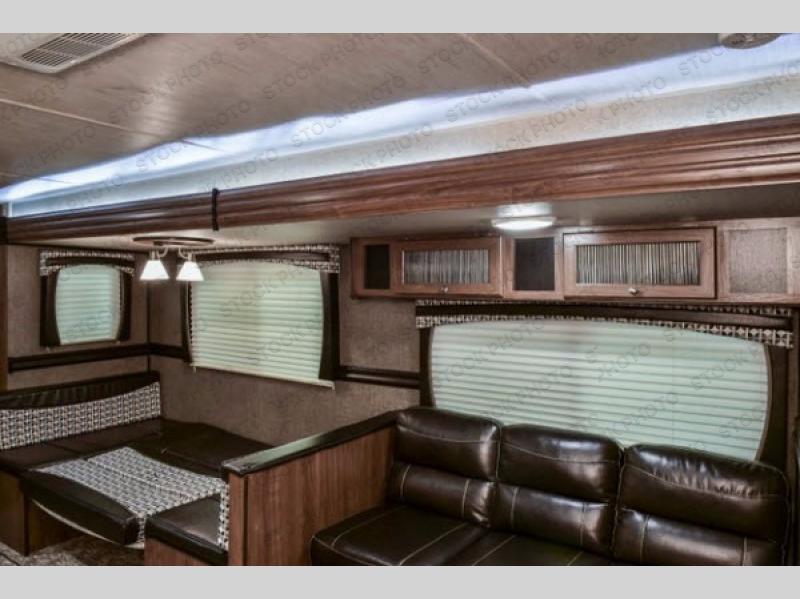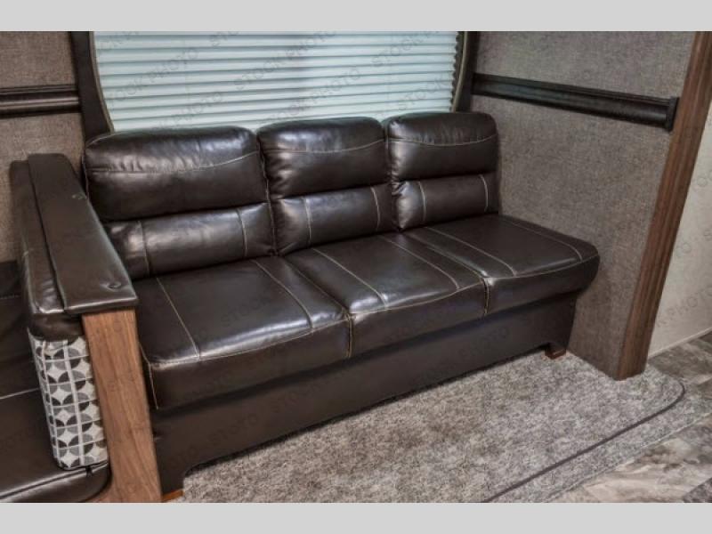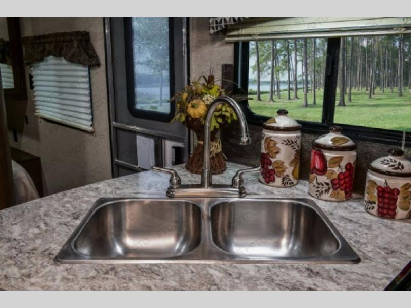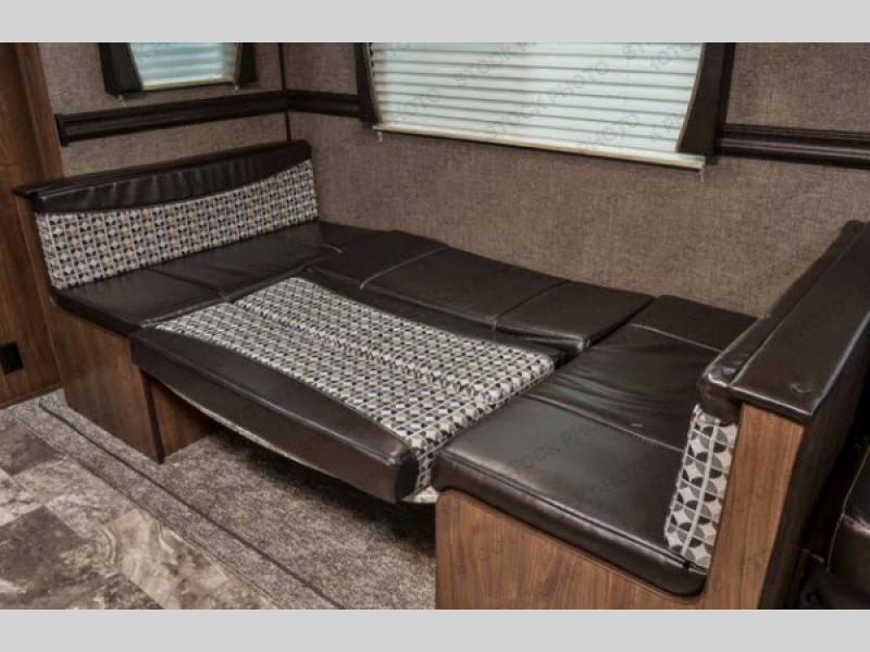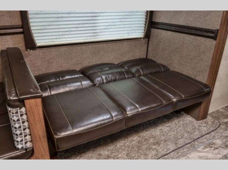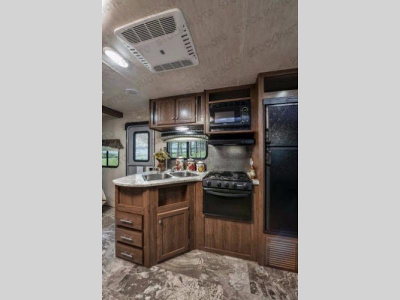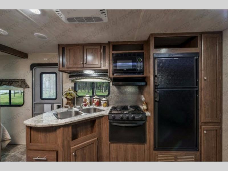 As you step inside this travel trailer you will appreciate how open an spacious this model feels. Along the road side there is a slide out with a sofa, an overhead cabinet, and a u-shaped dinette. The kitchen amenities are located along the door side. Here you will find a double sink, a three burner range, an overhead cabinet for your dishes, a refrigerator, plus a pantry for your canned goods. There is also an entertainment center near the entry door.