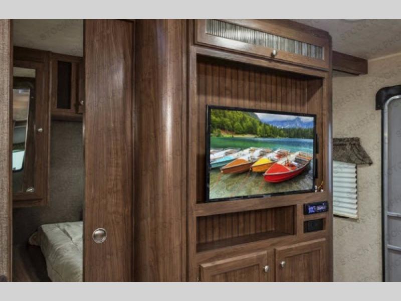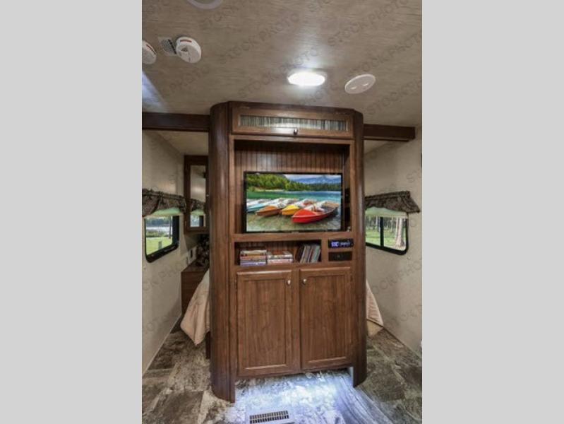 Along either side of the entertainment center there are sliding doors which create more privacy in the front bedroom for you. In this room you will also find a queen bed, nightstands, plus plenty of storage throughout.