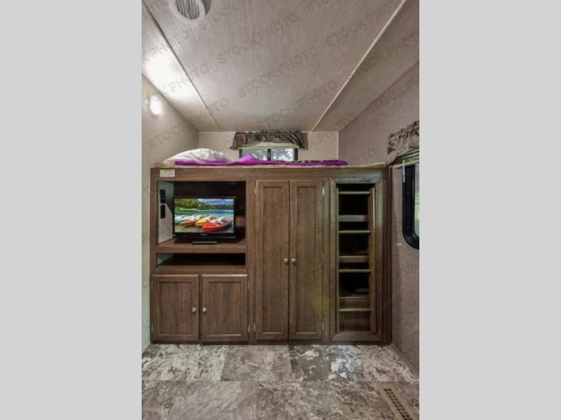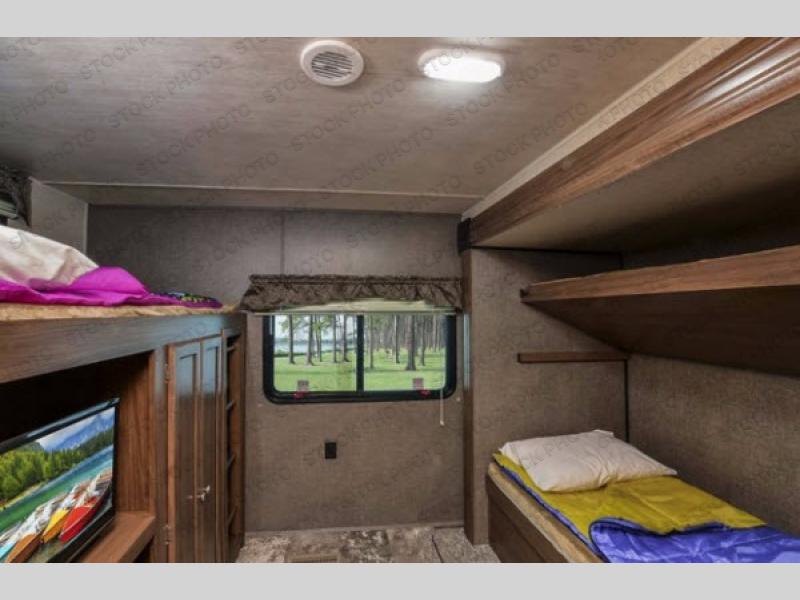 The rear bunk house features a slide out with a sofa and a bunk above. Along the opposite side of the room there is an entertainment center where you can place a TV, a wardrobe for your hang up clothes, and an upper bunk, plus so much more!
