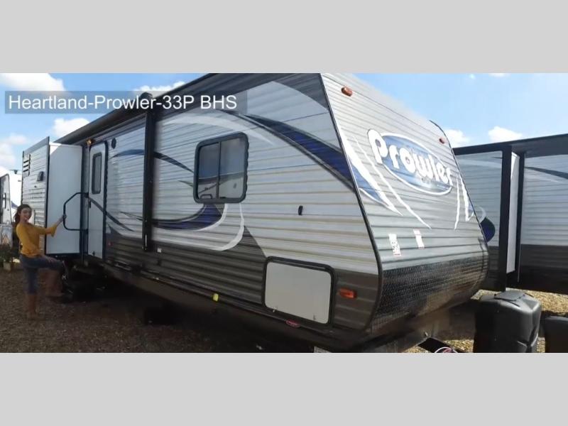 Step inside this Heartland Prowler bunkhouse model 33P BHS that easily sleeps 8-9 individuals. This unit features a rear private bunkhouse for the kids or extra guests, triple slide outs for added interior space, and a convenient kitchen island, plus more.