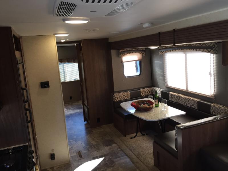 In the living area and kitchen combined enjoy ample seating with a slide out u-shaped dinette and sofa. There are storage cabinets above the sofa. Just off the slide on the dinette side is a pantry for food items. The kitchen is to the left of the main entry door and features an angled counter-top with double sink, a three burner range and refrigerator, plus a second pantry for food storage. There are also plenty of overhead cabinets, and lower cupboards too.