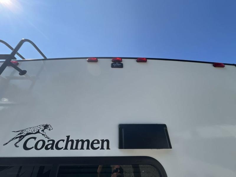 Step inside and notice the open concept living space with the dual opposing slides fully expanded. There is a corner storage/entertainment center and free standing dining table for four in the slide to your immediate left. Across the rear wall you will find two lounge chairs and a bit of storage in upper cabinets that stretch the entire width of the unit.