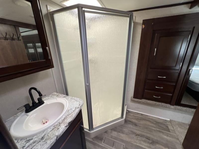 Head up the steps to the front bedroom and complete side aisle bath. At the top of the steps on your left enjoy an angled shower, toilet, and vanity with sink, plus an overhead medicine cabinet. There is a convenient second bath door that allows access into the bedroom, plus there is linen storage inside the bath from the bedroom slide out.