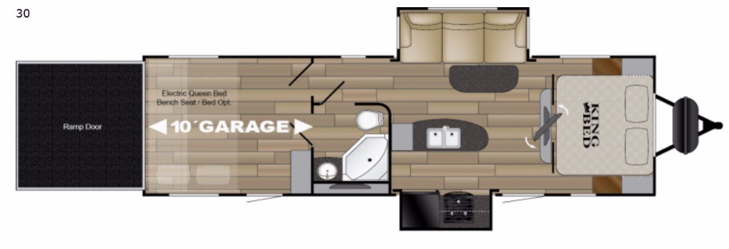 The garage provides 10' of space for your off-road toys and gear. After your things are unloaded you can set up the optional queen bed with bench seat option if you chose it for more seating during the day, and sleeping space at night. You will also find another entrance door from the outside in the garage, so after your things are unloaded you can have easy access to the garage without using the rear ramp door, plus so much more!