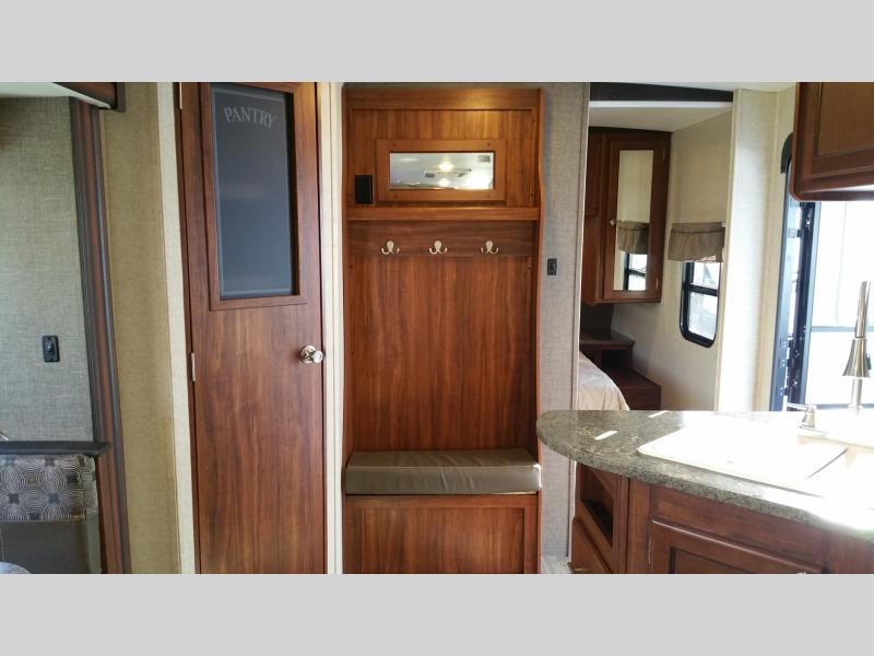 Straight inside the main entry door you will find a bench with coat hooks above, and a corner pantry for dry and canned good storage. Continue further in and see a large slide out u-shaped dinette and sofa with overhead storage. The slide provides additional floor space when fully extended making plenty of space to move about.