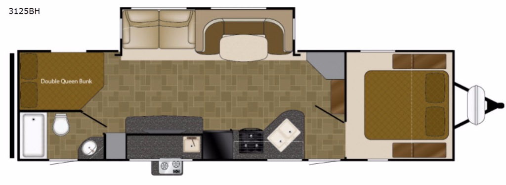 Enter this Wilderness 3125BH and be pleasantly surprised at the space you find. This travel trailer by Heartland RV offers a large slide out in the main living and kitchen area, dual entry doors for convenience, a set of queen size bunk beds, and a rear bath with quick outside access, plus an outdoor kitchen!