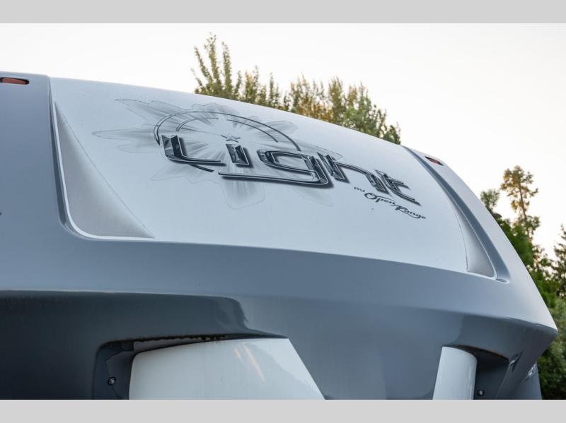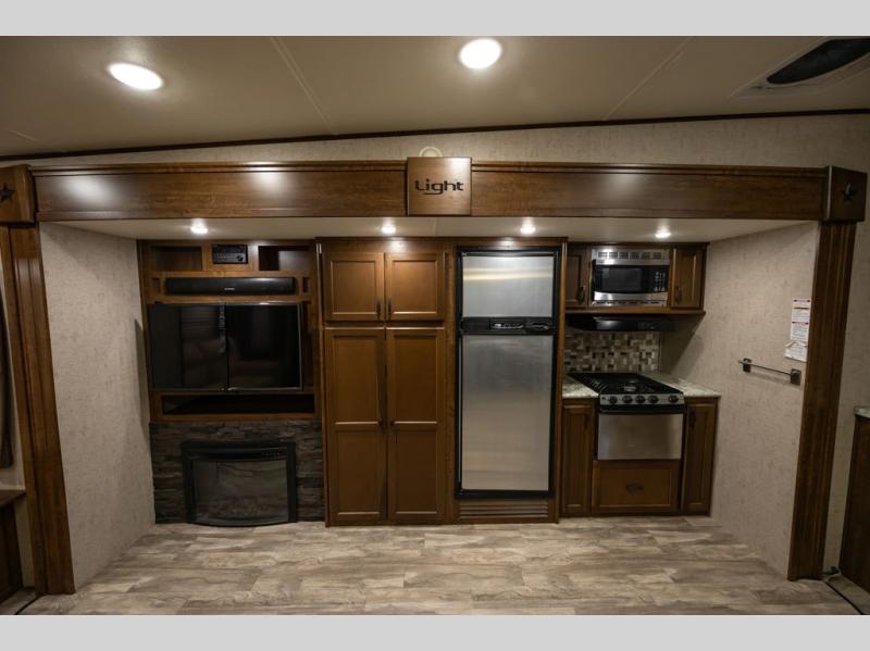 This Open Range Light fifth wheel model LF319RLS features triple slides, a rear living layout with a fireplace, a convenient kitchen island on castors, and so much more!