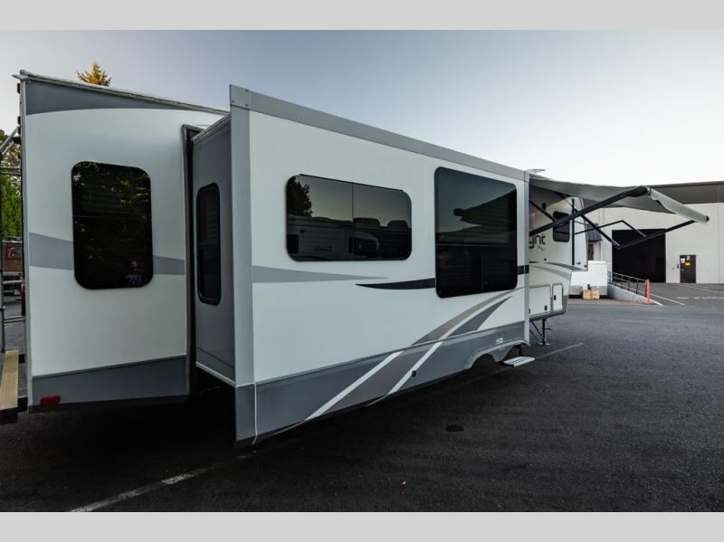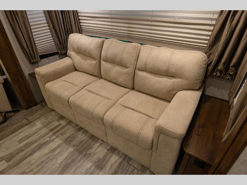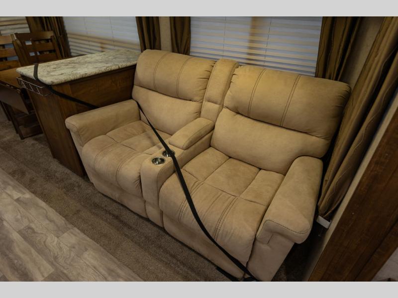 Step inside and move left into the main combined kitchen and living space. There are dual opposing slides which create a wide open spacious feel. To the left of the door there is a free standing table and chairs, plus theatre seating for two including cup holders and overhead storage in the first slide. Along the rear wall there is a tri-fold sofa with queen bed including end tables and overhead storage.