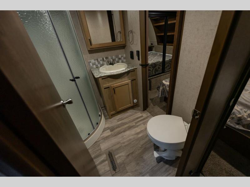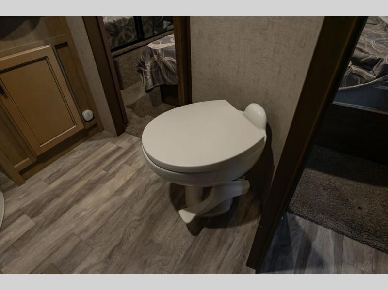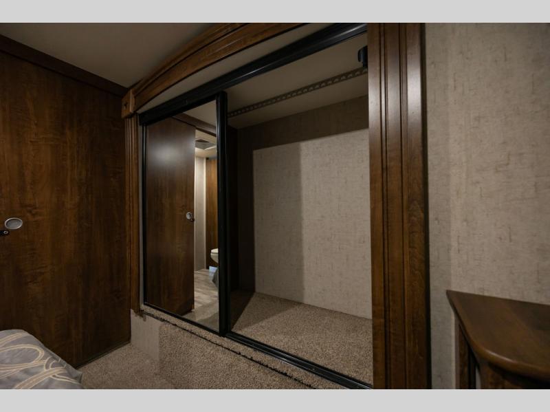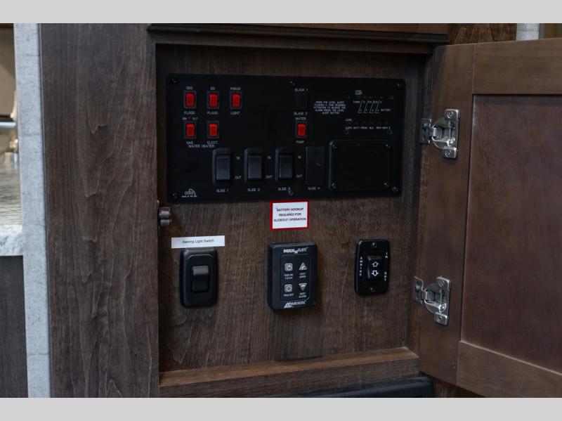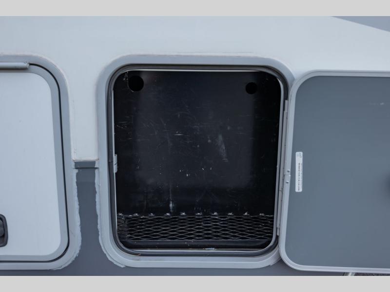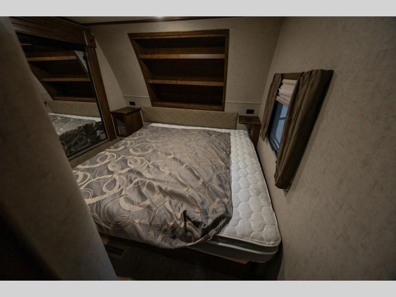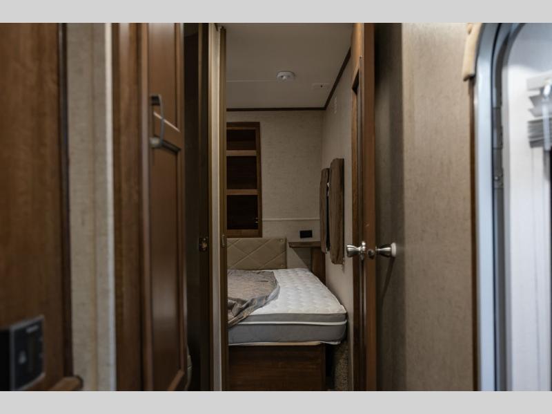 Step up the steps to the right of the entry door and find a complete bath and front bedroom suite. The bath provides a radius shower, sink, toilet, and linen cabinet that has also been prepped for a washer and dryer if you choose to add. The bath also features a convenient pocket door that leads directly into the bedroom where you will enjoy a queen size bed including nightstands with open storage below and a cargo net on either side, plus a slide out wardrobe with mirrored doors, and drawers inside, plus so much more.