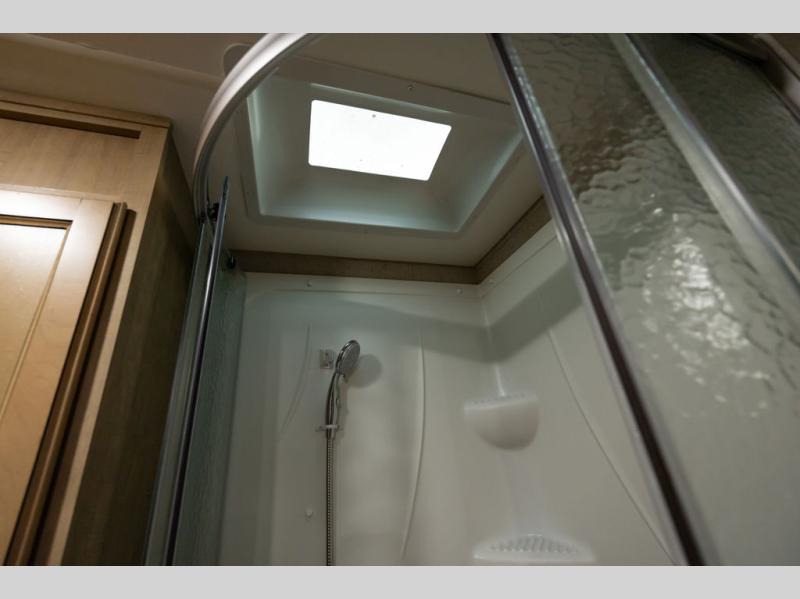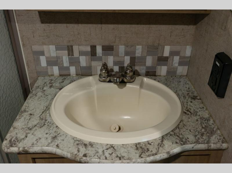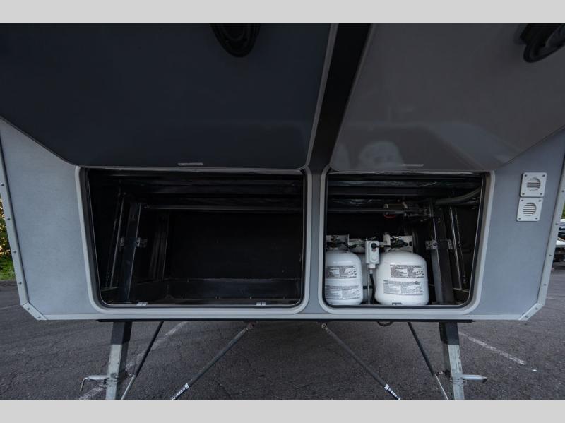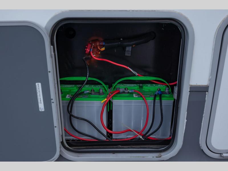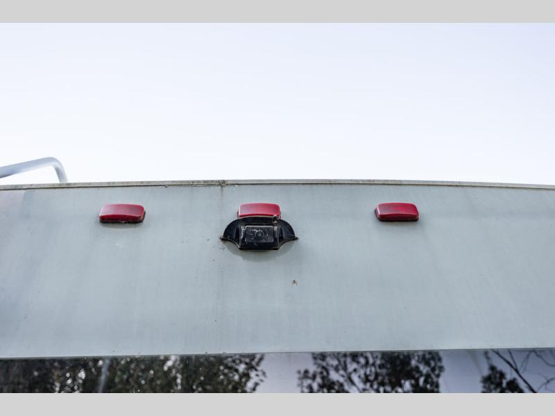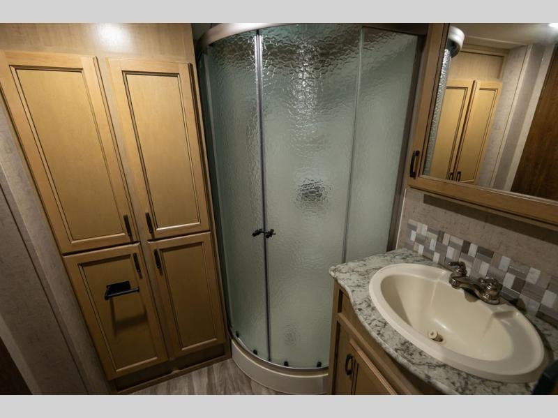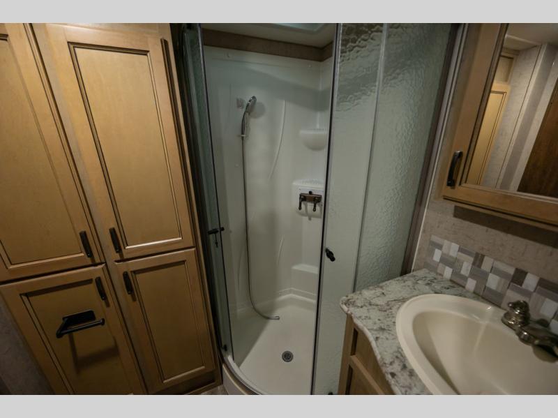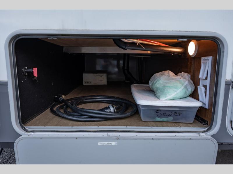 Step up the steps to the right of the entry door and find a complete bath and front bedroom suite. The bath provides a radius shower, sink, toilet, and linen cabinet that has also been prepped for a washer and dryer if you choose to add. The bath also features a convenient pocket door that leads directly into the bedroom where you will enjoy a queen size bed including nightstands with open storage below and a cargo net on either side, plus a slide out wardrobe with mirrored doors, and drawers inside, plus so much more.
