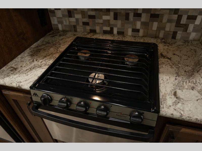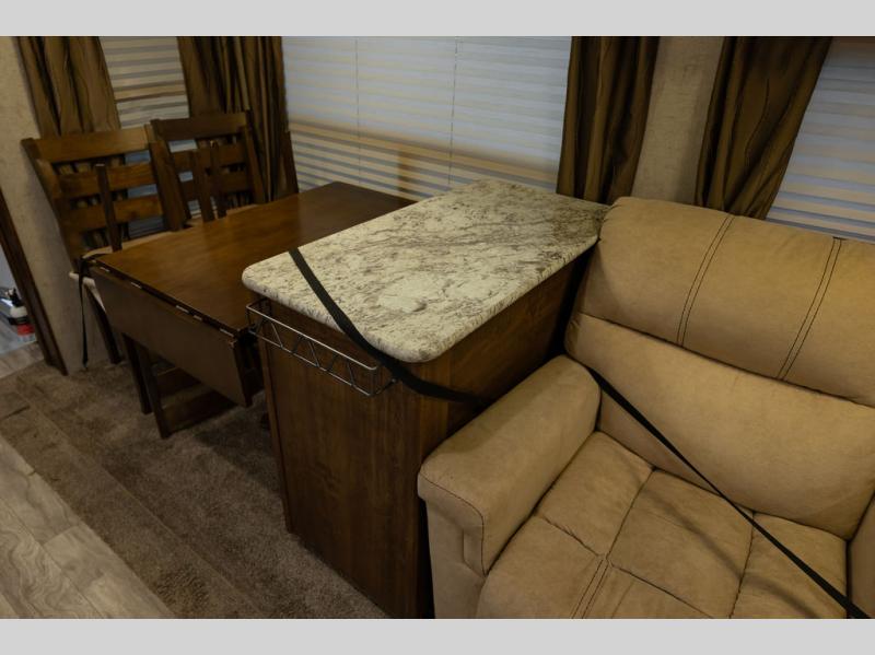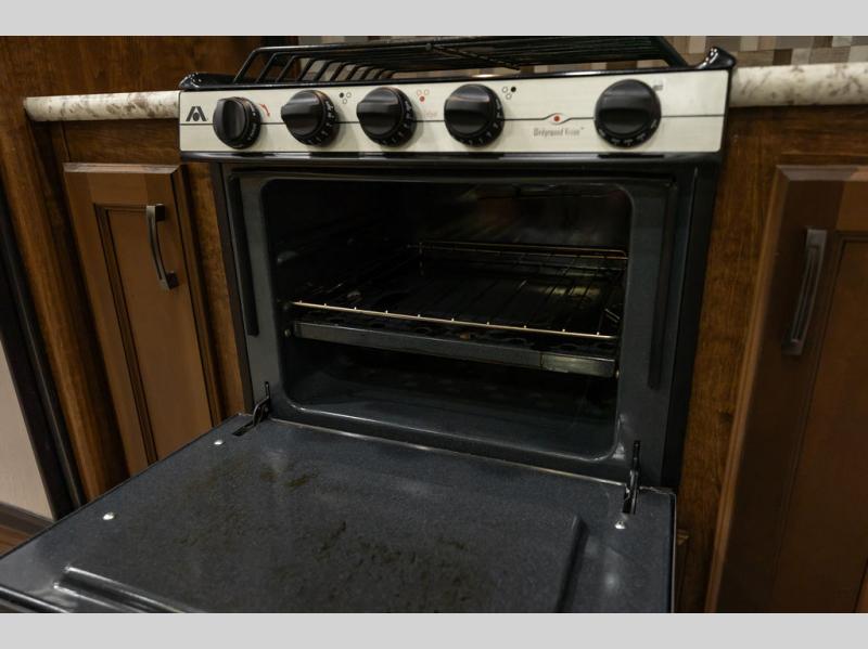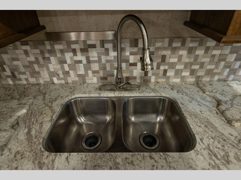 Opposite you will find a second slide out with a three burner range including an overhead microwave oven, a refrigerator, pantry, and entertainment center with fireplace below. The kitchen island on castors can be moved around to where you need it most whether for prep space while cooking, or to place snacks on while you hang out and enjoy family time inside. There is also a double kitchen sink along the interior wall that features additional counter space and overhead cabinets, plus storage below.