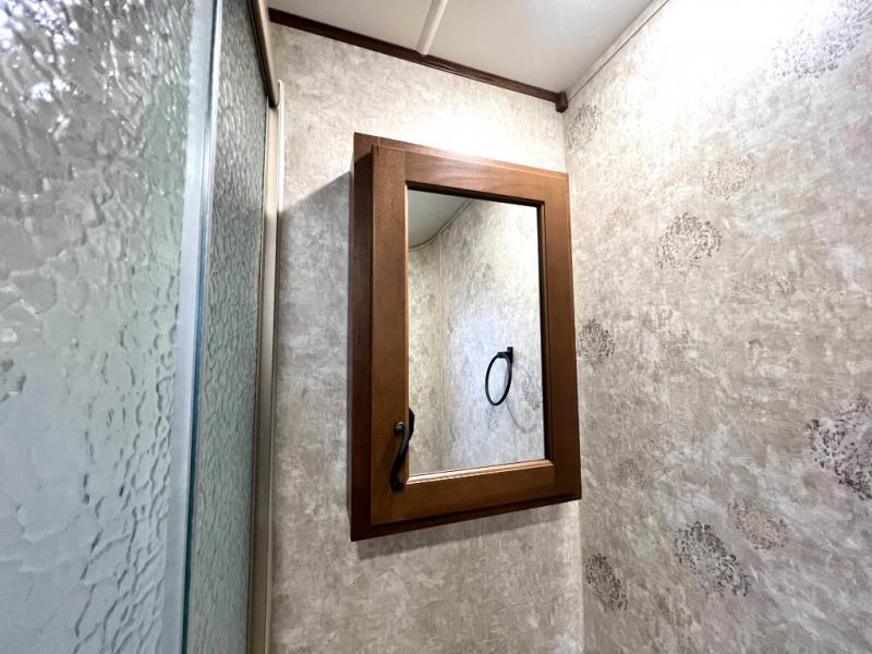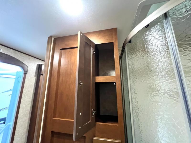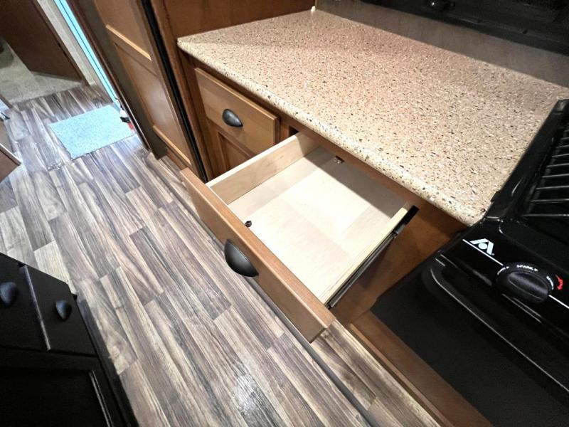 Along the rear wall there is a tri-fold sofa with queen bed including storage above to help keep things tidy and neat. The slide opposite features more seating with a theatre seat for two including cup holders, and a booth dinette. Both of which provide cabinets above for more storage needs. You can choose a U-lounge with fold-out queen bed and two tables option instead for seating and dining space if you wish.