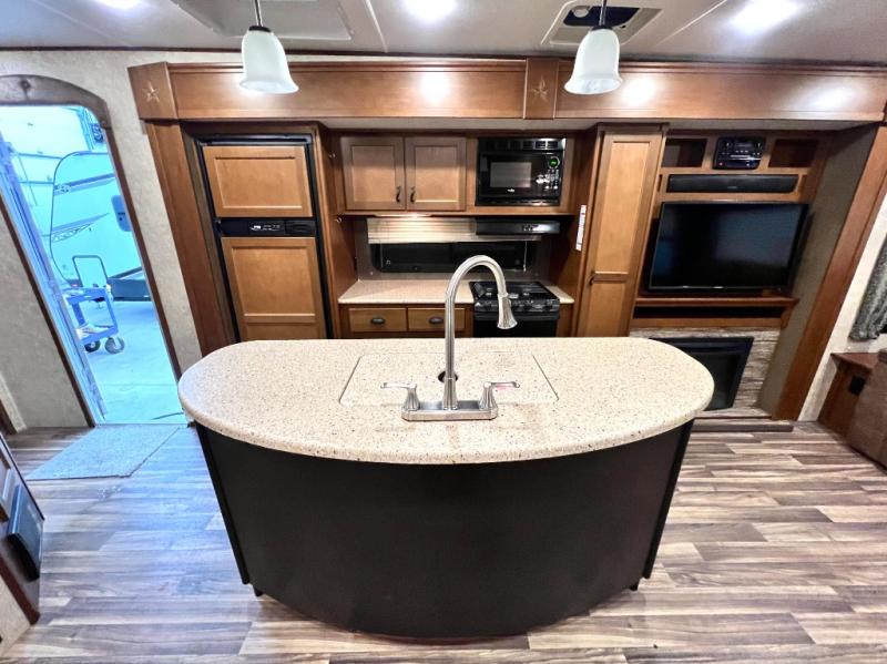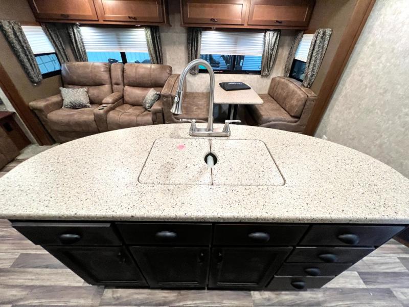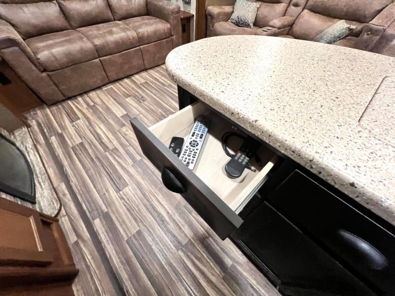 Along the curb side wall you will find a large slide out kitchen and entertainment center that starts with a refrigerator, a three burner range with overhead microwave, and a pantry. Overhead cabinets, lower cupboards and drawers provide ample storage for dishes and food items. The kitchen island off center features more counter prep space, plus it is the location of the double sink for easy clean up. At the end of this slide you will find an entertainment center with fireplace which can easily be viewed from any seating in the room.