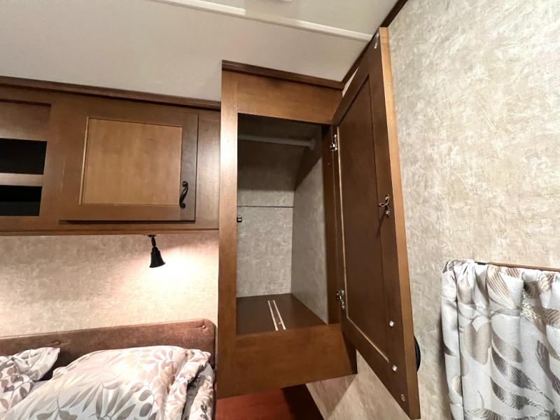 The front master bedroom features a large wardrobe for clothing storage, a queen size bed with overhead cabinets, and two shirt closets above nightstands, one on each side.