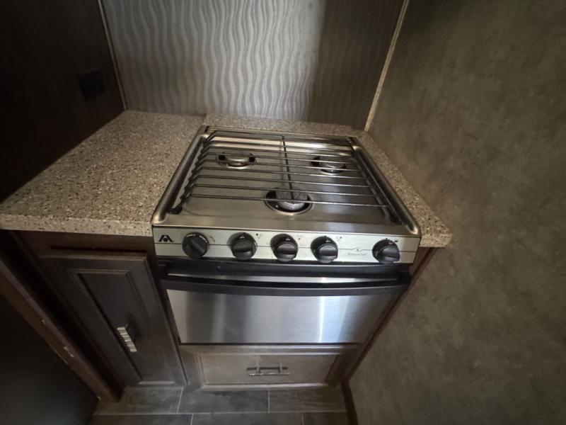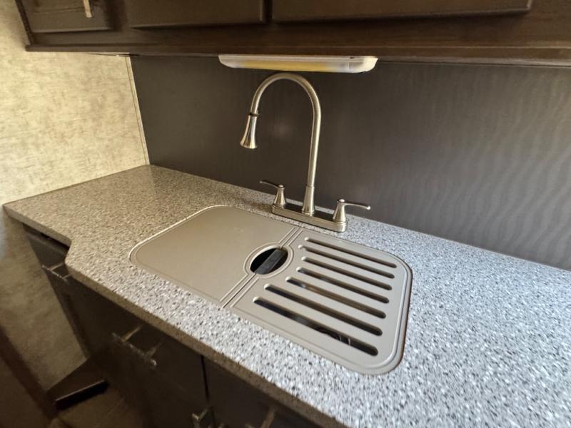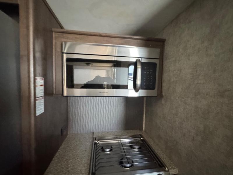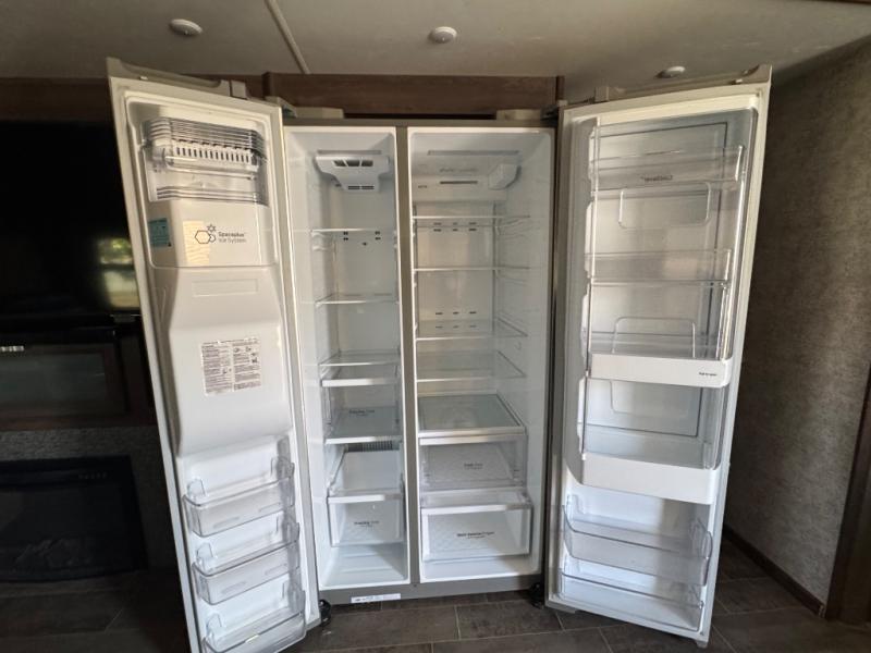 Back down at the main level notice the wide open space thanks to dual opposing slide outs. There is a dining table with four chairs and theater seating for two with cup holders along the curb side. Opposite find a kitchen with a three burner range including overhead microwave oven, refrigerator, pantry, and an entertainment center, plus fireplace all within a slide out. You can even choose an optional 12 cu. ft. refrigerator or 23 cu. ft. residential refrigerator. There is overhead storage and counter space with a double sink along the interior wall, plus an optional center island on casters for added prep space and serving area if you like.