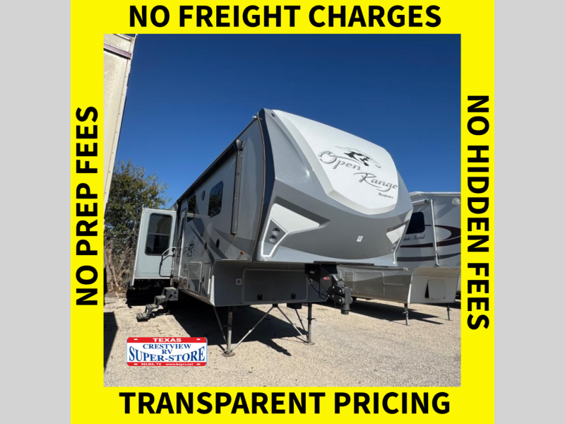 Camp comfortably in this Highland Ridge Open Range Roamer fifth wheel model RF348RLS. This unit features a rear living layout, triple slides for added interior space, and a king size bed!
