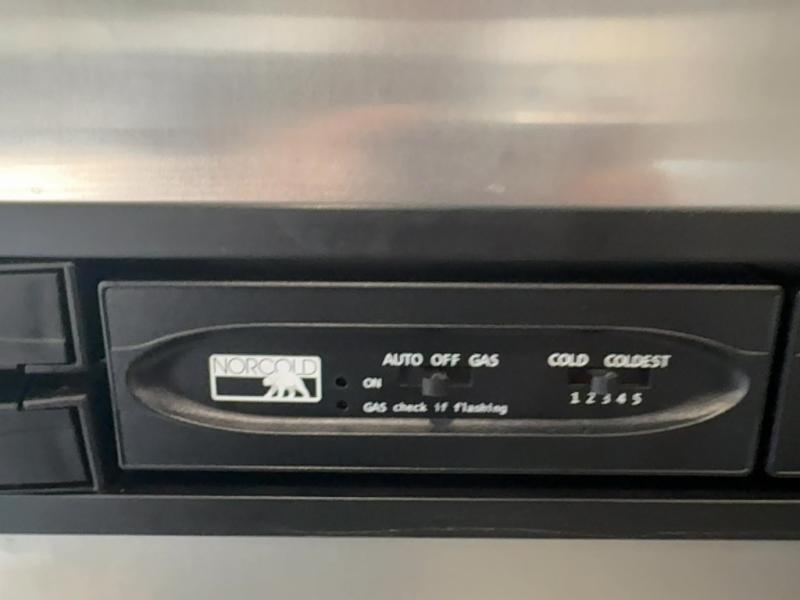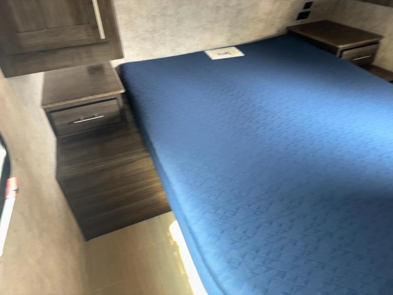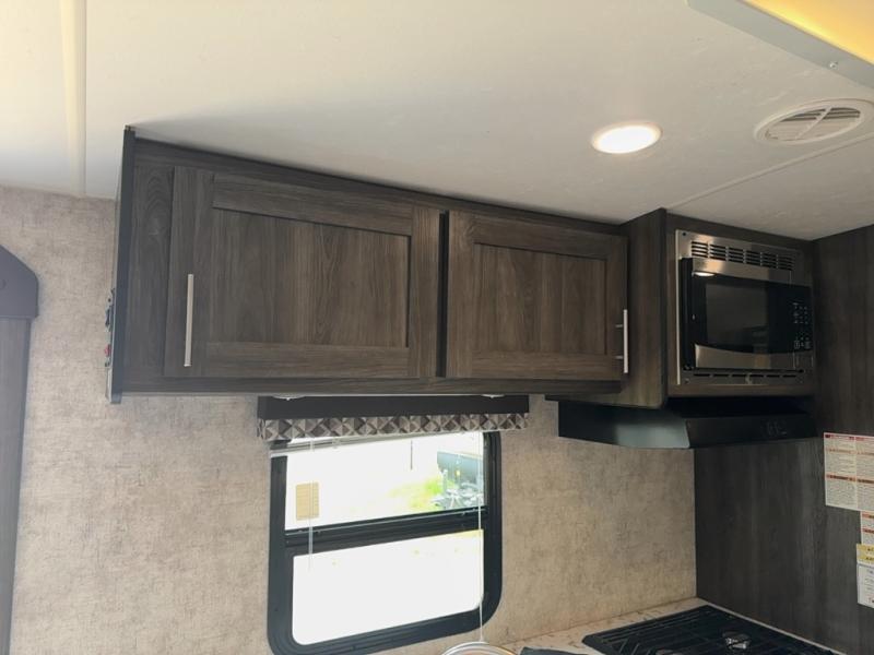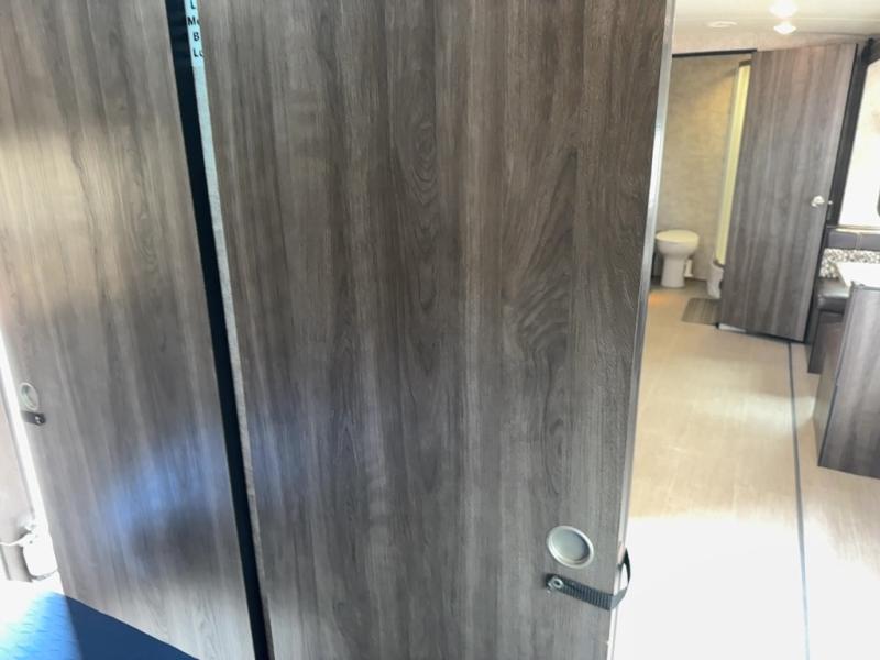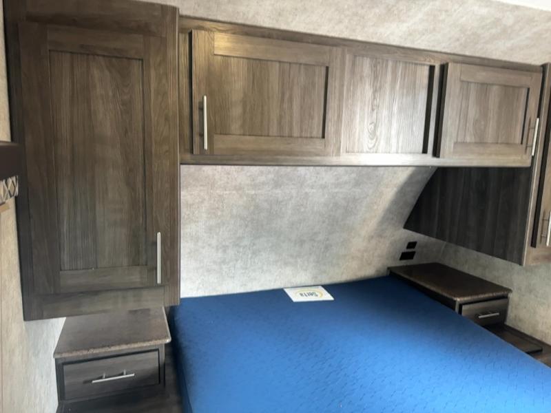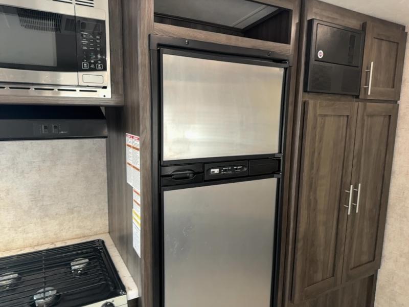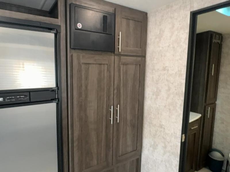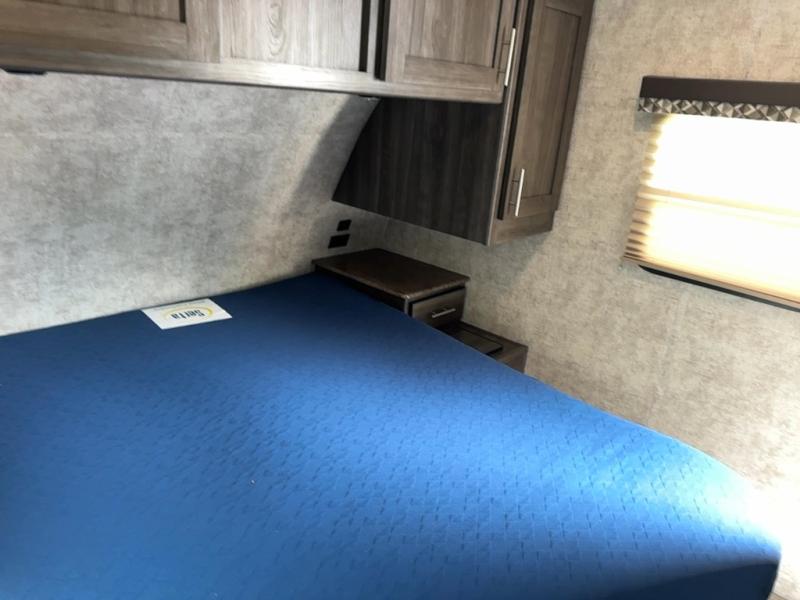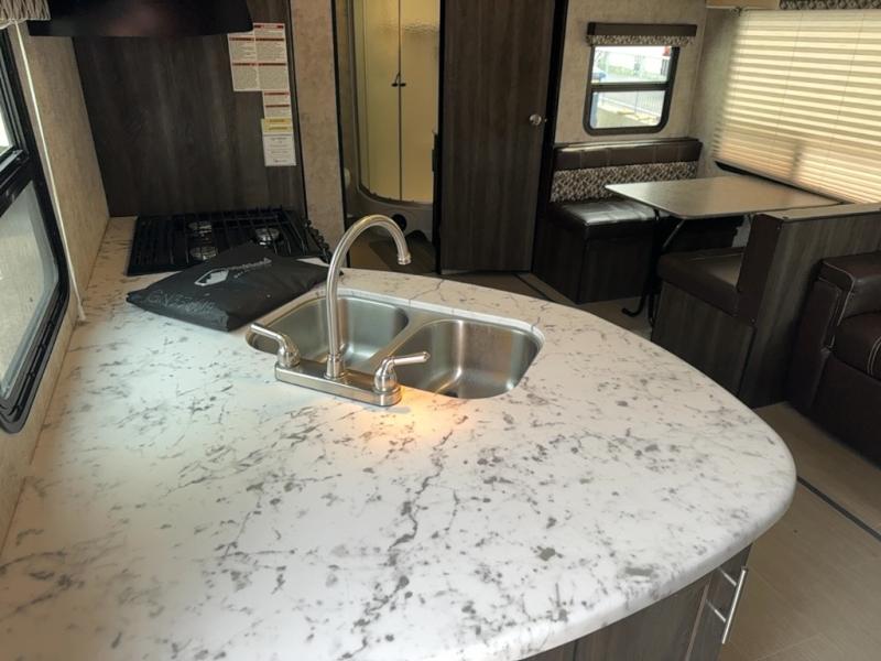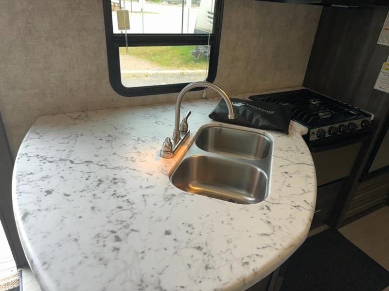 The kitchen features everything you need to cook up your next camp meal while you are away. There is a pantry/wardrobe, 6 cu. ft. refrigerator for your perishables, a three burner range, and double kitchen sink on an angled countertop allowing more space for preparing meals or cleaning dishes. You will also find plenty of storage cabinets both above and below the counter.