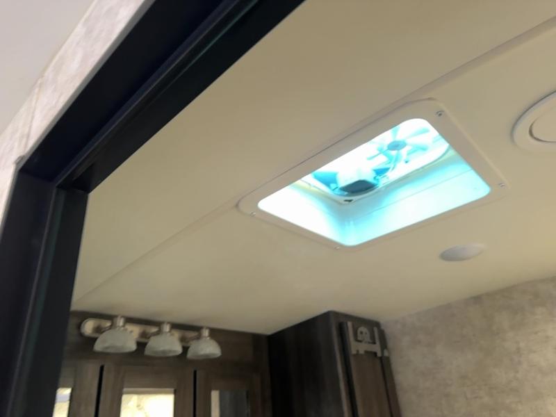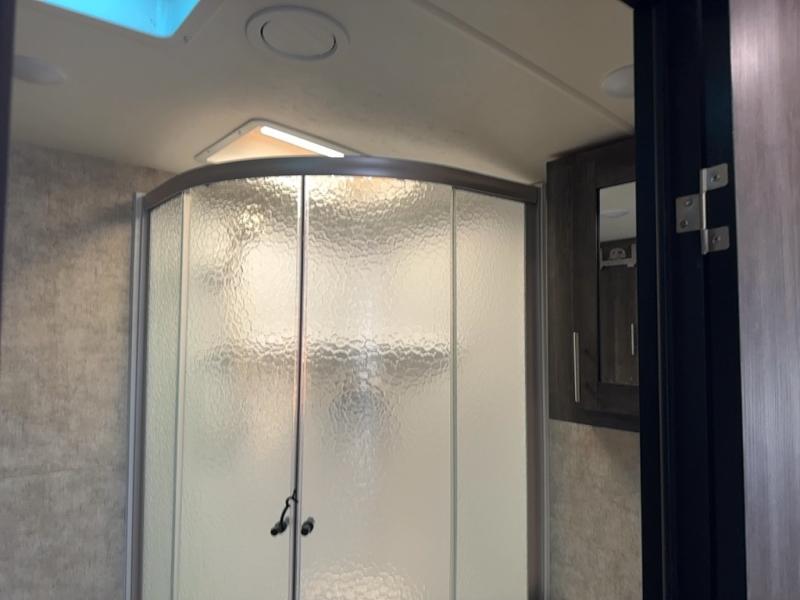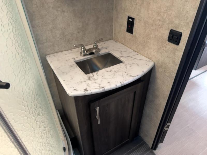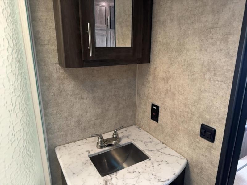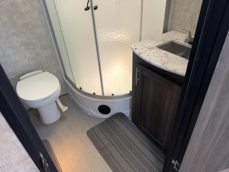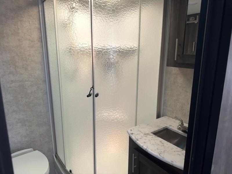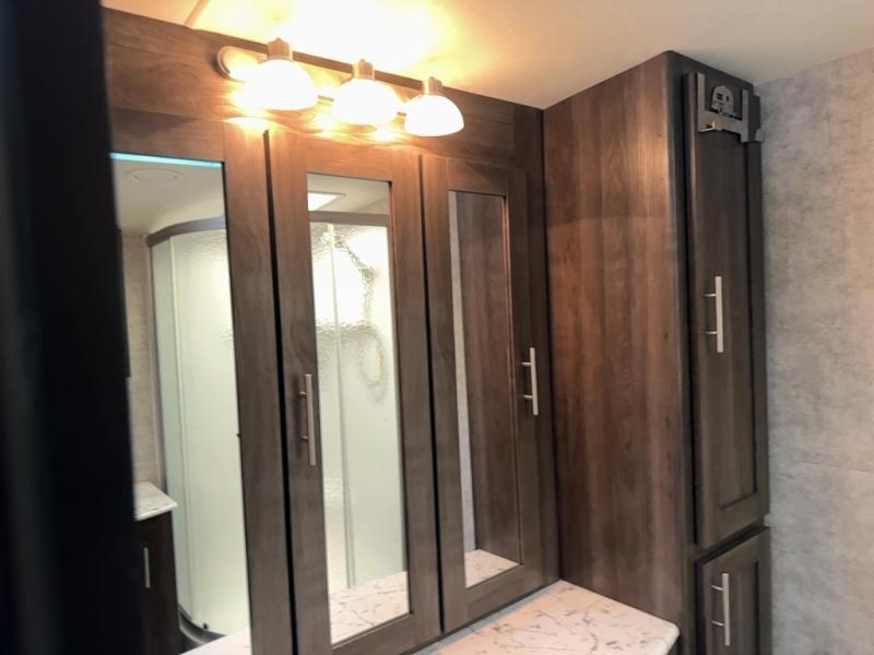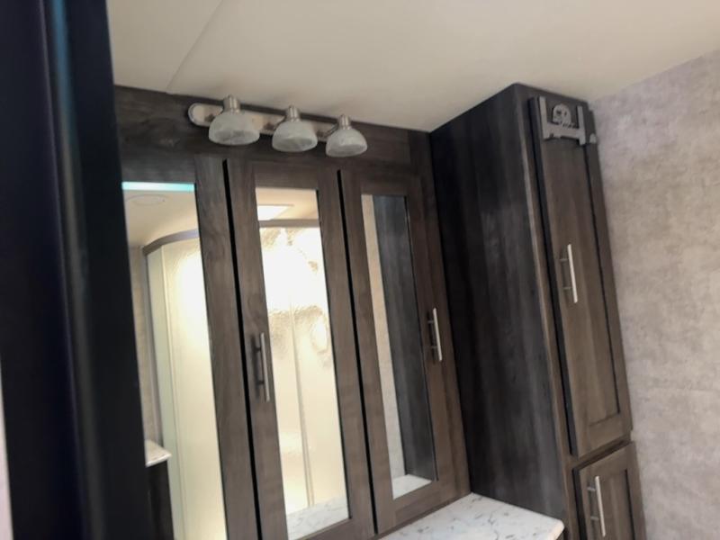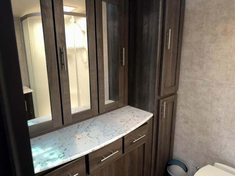 Continuing toward the rear of the this Open Range Ultra Lite you will find a full bathroom. Inside enjoy a radius shower, toilet, sink, linen cabinets, drawers, and an extra mirrored vanity.