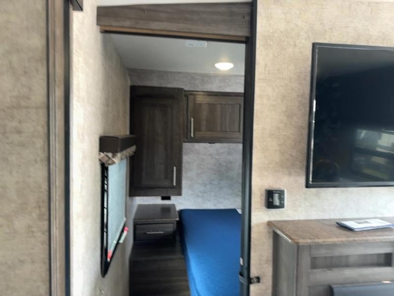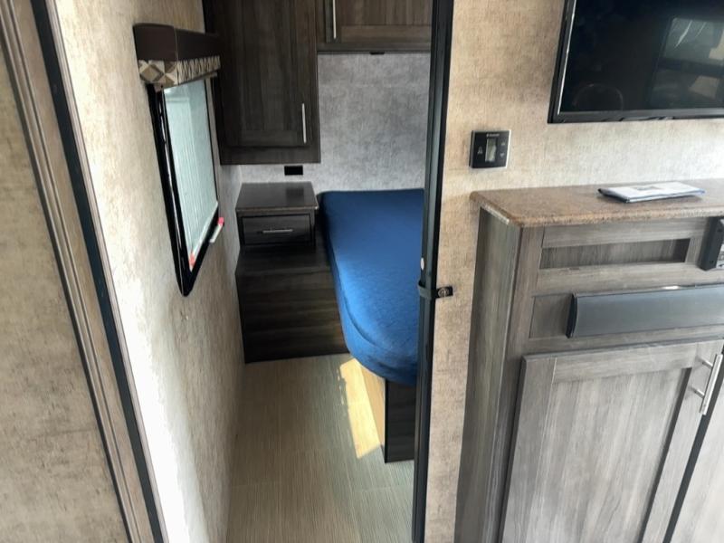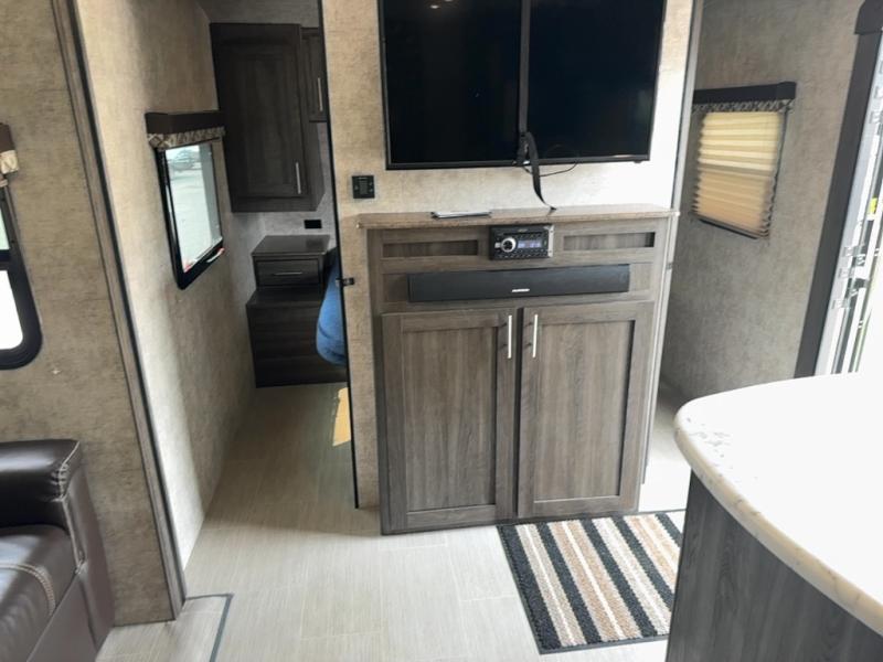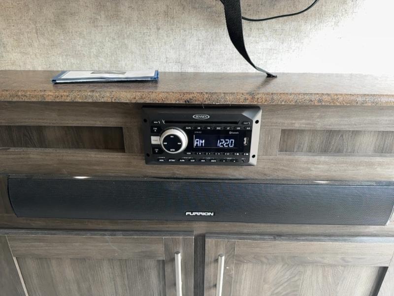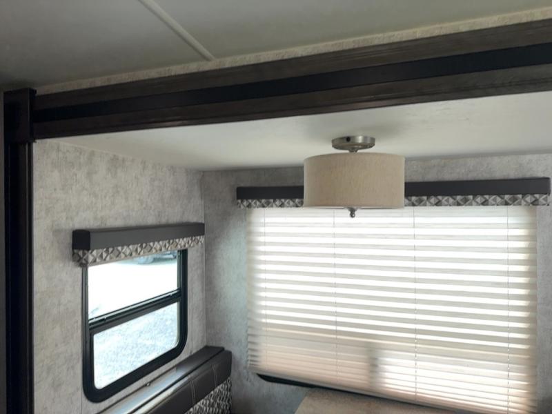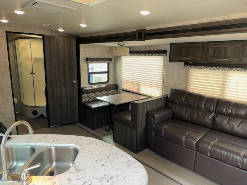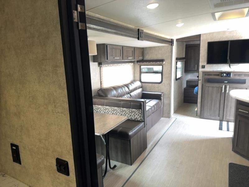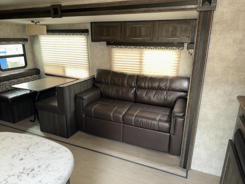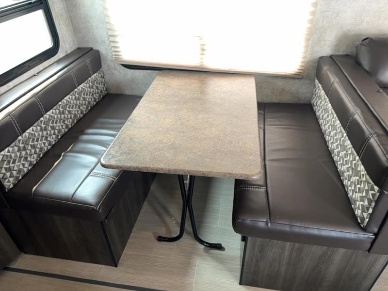 Step inside to find a slide out along the road side wall featuring a storage sleeper sofa and booth dinette providing plenty of seating. You can easily view the entertainment center on the interior wall. The seating can become extra sleeping space at night if needed for family and friends.