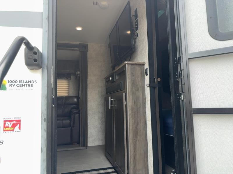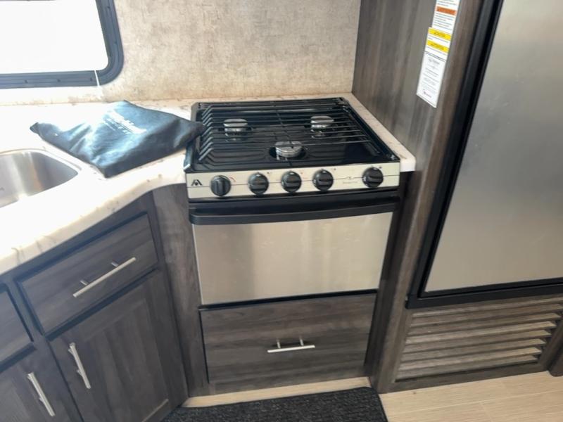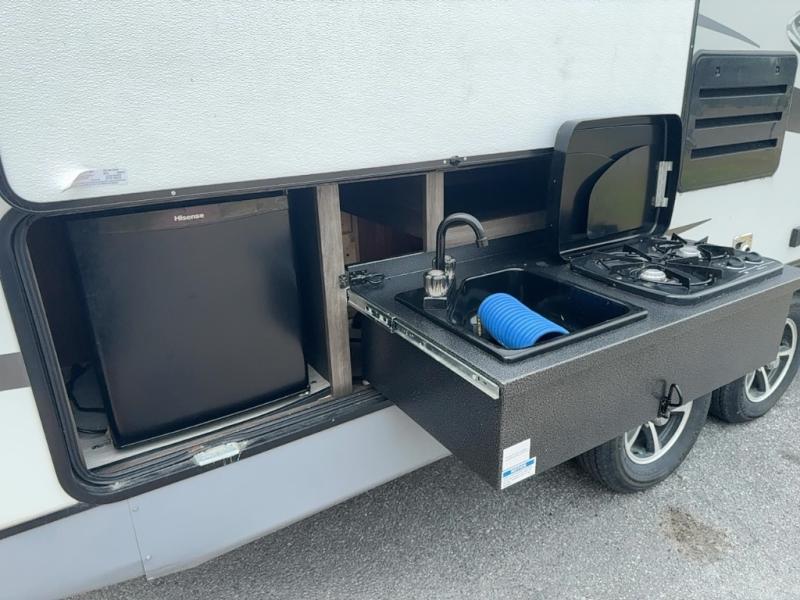 Outside you will enjoy the outdoor kitchen with a sink and two burner cooktop, and the exterior storage pass through compartments, plus much more inside and out!