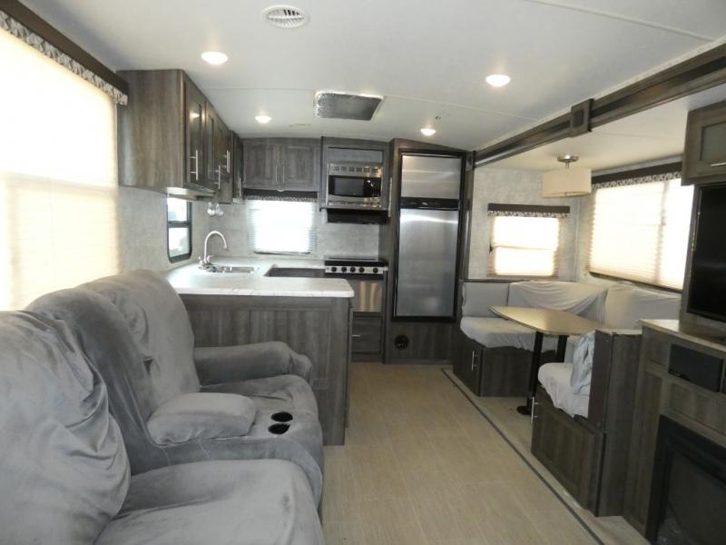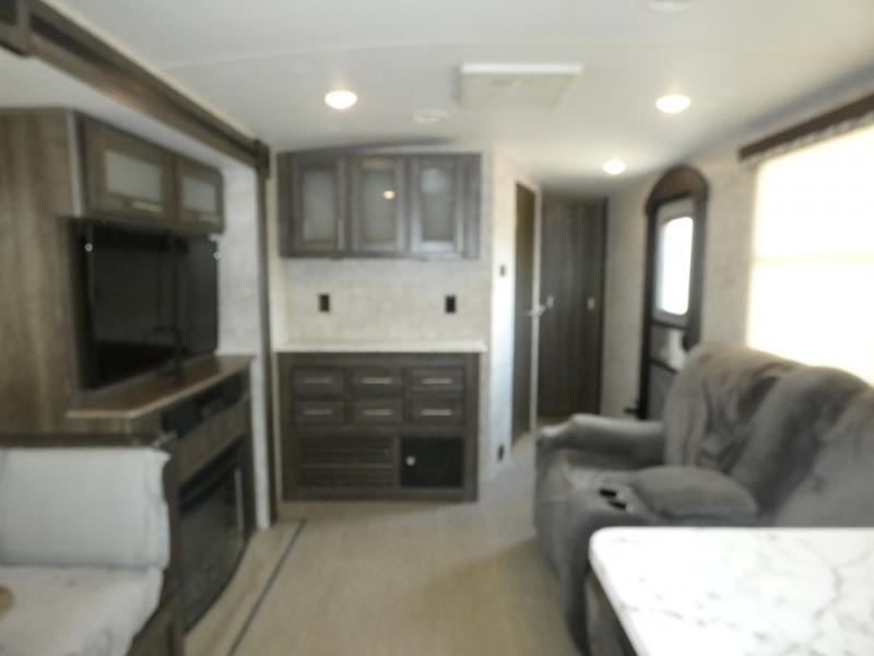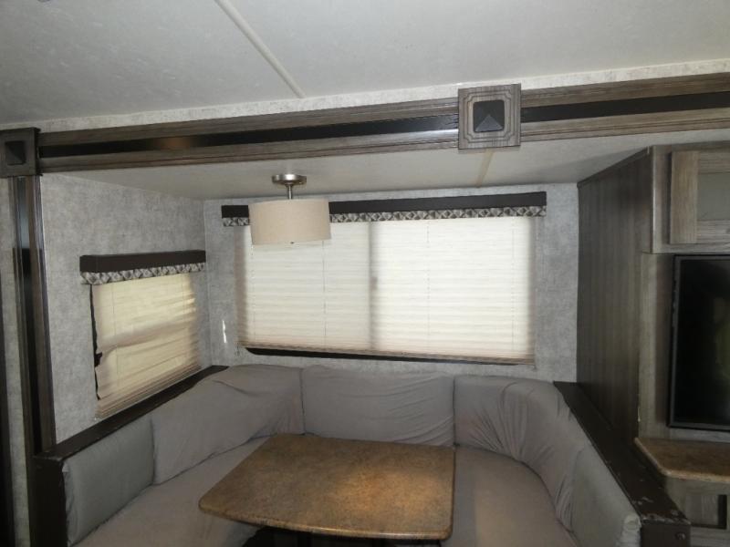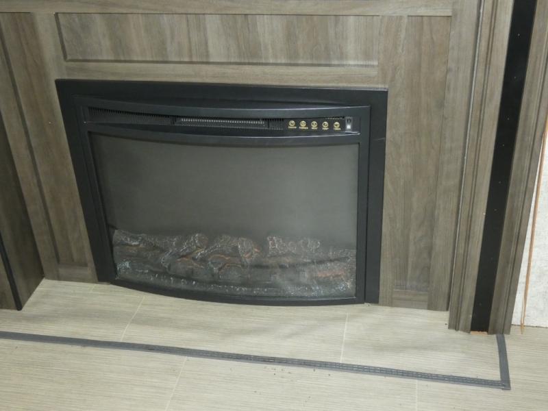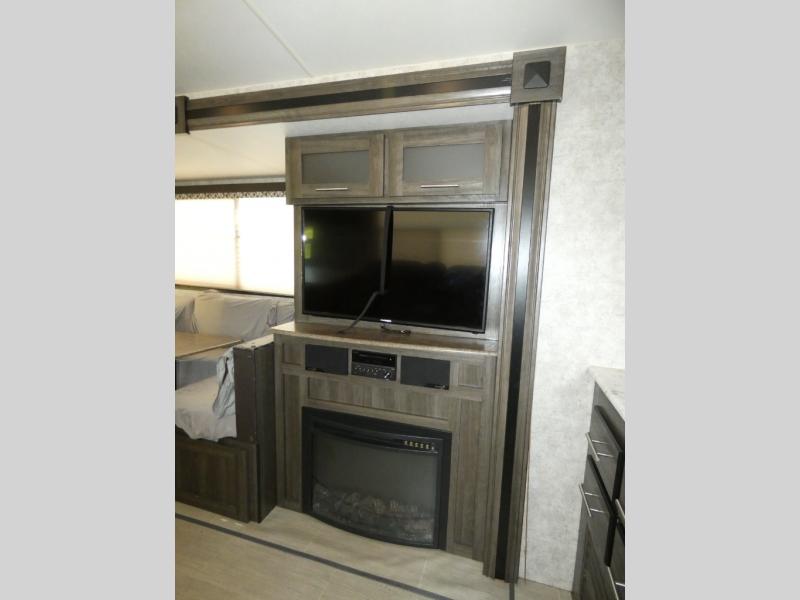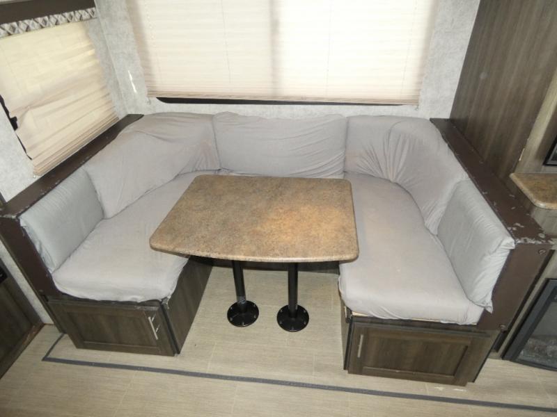 The single slide out allows you to play games or dine at the u-shaped dinette, and watch your favorite shows on the TV with entertainment center and fireplace below. There is a hutch along the interior wall providing additional storage.