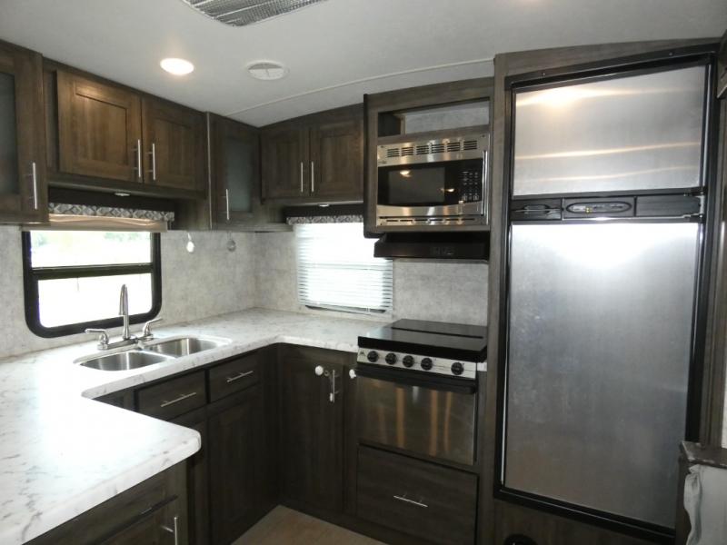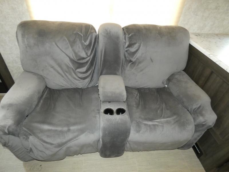 Heading towards the main living and kitchen area, you will find theater seating for two including cup holders along the curb side wall. Next, there is a l-shaped counter creating a u-shaped working area along the curb side wall. You can wash your vegetables and dishes in the double kitchen sink, and store items in the overhead cabinets. Along the rear wall you can cook your favorite camp meals on the three burner range with microwave above, and place your perishables in the refrigerator.