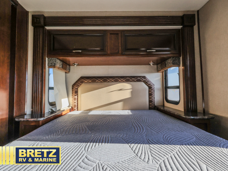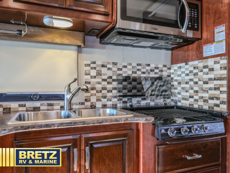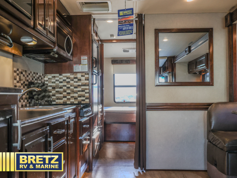Step inside model 31A right behind the front passenger seat. There is a 32" LED TV just around the corner with the kitchen appliances along the curb side of the unit. You will find that it is easy preparing light meals and snacks for your family with the double sink, three burner range, overhead microwave oven, and refrigerator provided. Opposite the refrigerator there is a pantry for your non-perishables.