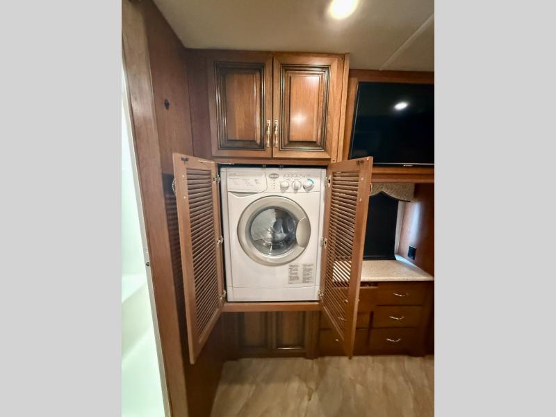 The fully equipped kitchen features a residential refrigerator, three-burner range, double sink, and microwave to make meals on the go easy. A mid-coach half bath adds convenience for guests, while the private rear master suite offers a queen bed slide, dual nightstands, wardrobes, and a 32" LED TV with dresser. You’ll also appreciate the included all-in-one washer/dryer for extended stays. Step through the sliding pocket door to the spacious rear full bath with shower, vanity, and linen storage.