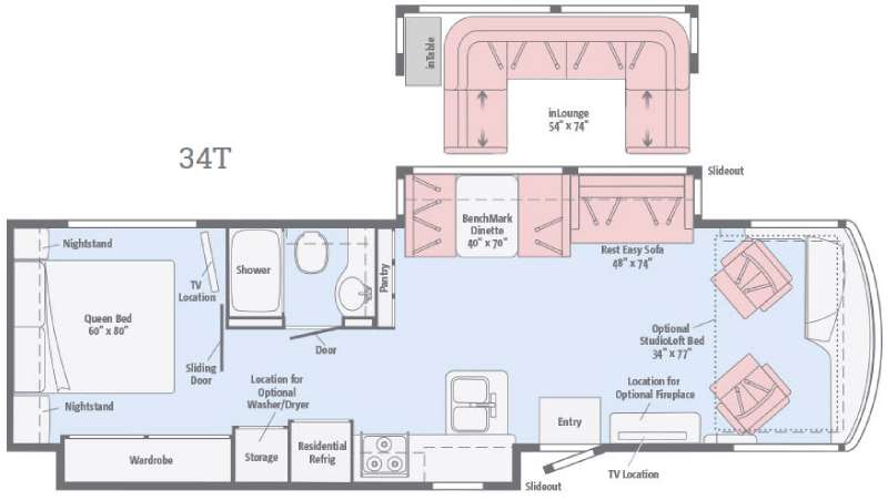 As you enter model 34T straight ahead notice the slide out Benchmark dinette and Rest Easy sofa or choose the optional inLounge with InTable instead. The Dinette and sofa provide five seatbelts. The lounge features extendable seating on both sides, and three sets of seat-belts for safe traveling.