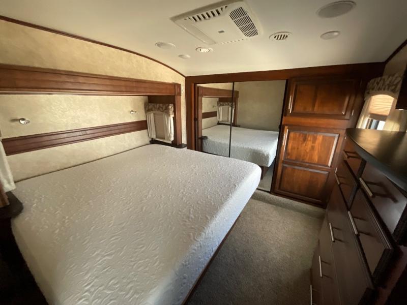 The other slide out in the main living area includes a theater sofa with cup holders, a microwave, a three burner range, a pantry, and a refrigerator. Adjacent to the slide out you will enjoy a walk-in pantry for storing your food items, a closet and an overhead cabinet. The double kitchen sink is located in the large kitchen island.