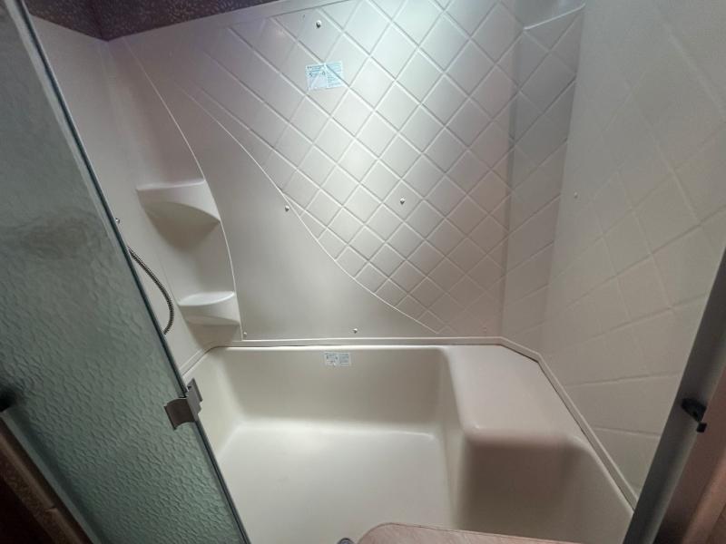 Along the rear wall there is an entertainment center with a fireplace. There is an additional slide out with a tri-fold sofa, pantry, refrigerator, microwave, and three burner range along the road side. Along the interior wall in the kitchen area you will find a counter which provides extra counter space, overhead cabinets, and a double kitchen sink. Enjoy the extra counter space of the optional rolling island, plus the convenience of moving it around to the best spot for you.