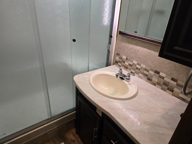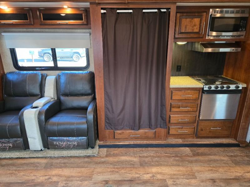Along the rear wall there is an entertainment center with a fireplace. There is an additional slide out with a tri-fold sofa, pantry, refrigerator, microwave, and three burner range along the road side. Along the interior wall in the kitchen area you will find a counter which provides extra counter space, overhead cabinets, and a double kitchen sink. Enjoy the extra counter space of the optional rolling island, plus the convenience of moving it around to the best spot for you.