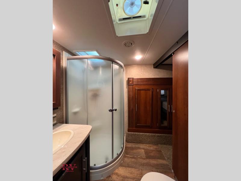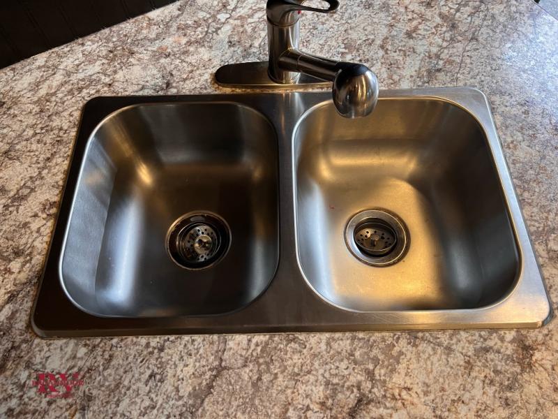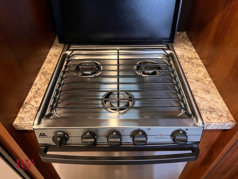 As you enter model 27.5RLTS, to the left there is a slide out with an entertainment center with an option to add a fireplace below, and a free standing table & chairs. The rear living area has two recliners. The road side slide out offers a hide-a-bed sofa, refrigerator, and a three burner range with microwave above. Along the interior wall in the kitchen/living area there is plenty of counter space, a double kitchen sink, as well as overhead cabinets for your dishes.