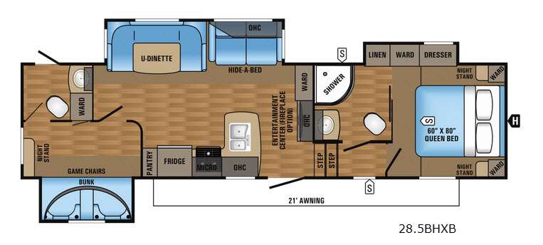 Outside enjoy exterior storage for all of your extra camping gear and a 21' awning, plus much more!