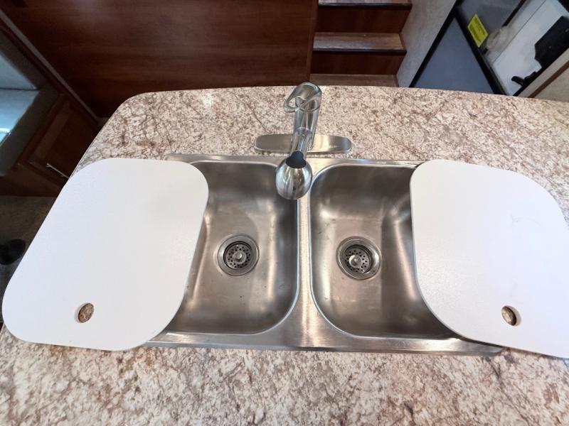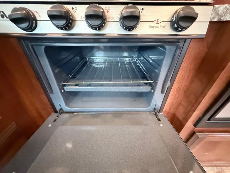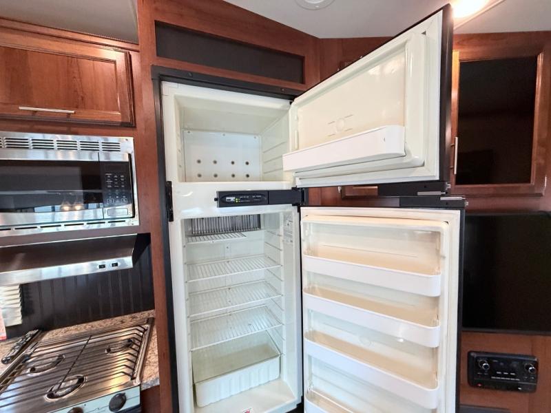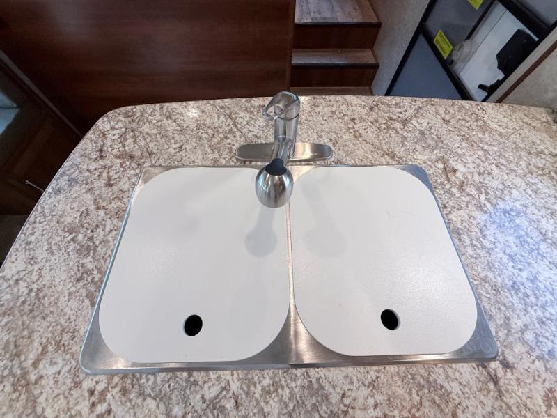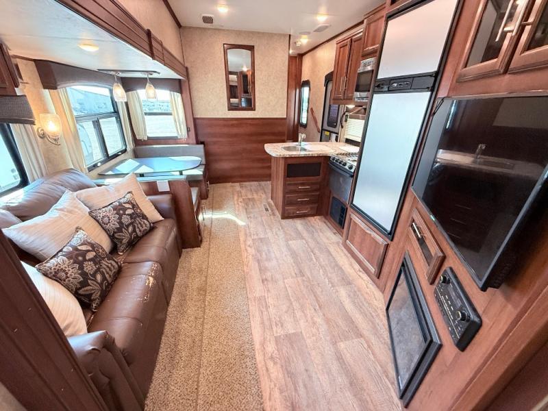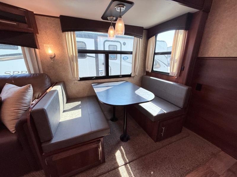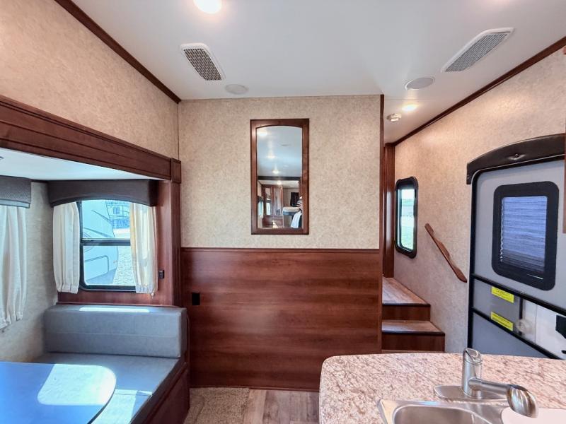 As you step inside this fifth wheel, to the left is the kitchen featuring a L-shape countertop with a double kitchen sink. Continuing along the curb side there is a three burner range, overhead microwave, refrigerator, and corner entertainment center. The opposite side of the fifth wheel has a slide with a hide-a-bed, and booth dinette or you can choose an optional free-standing table and chairs.