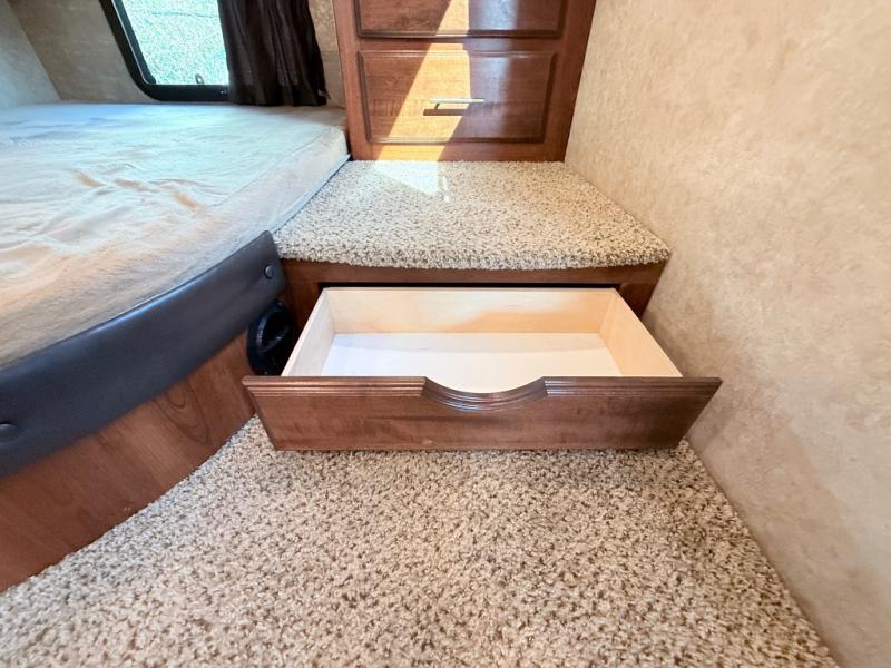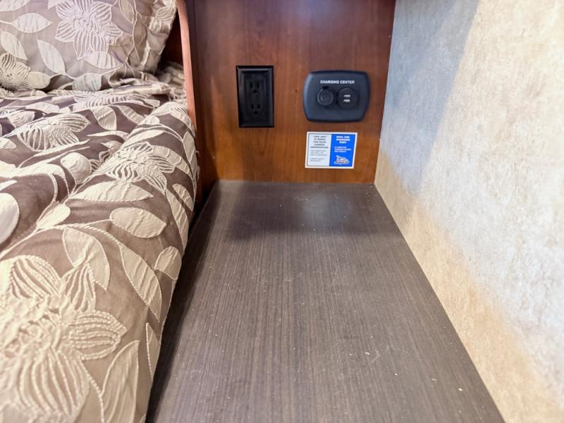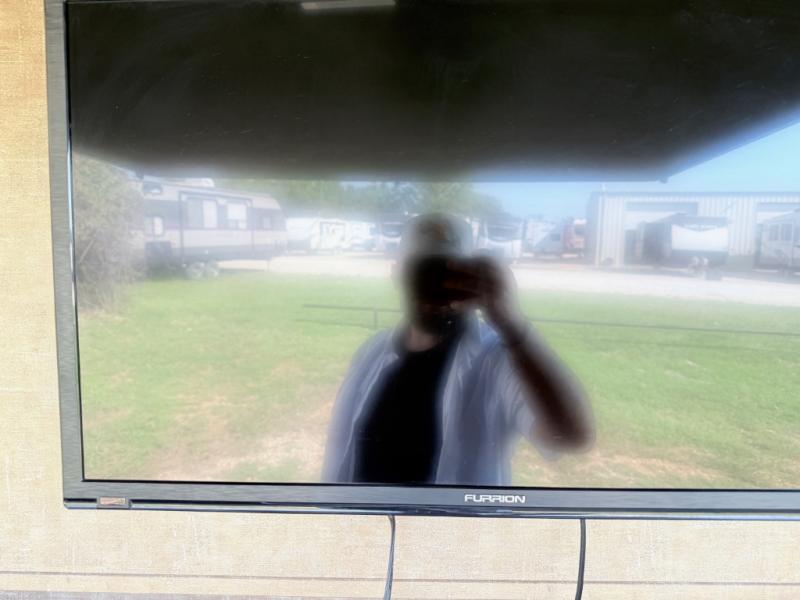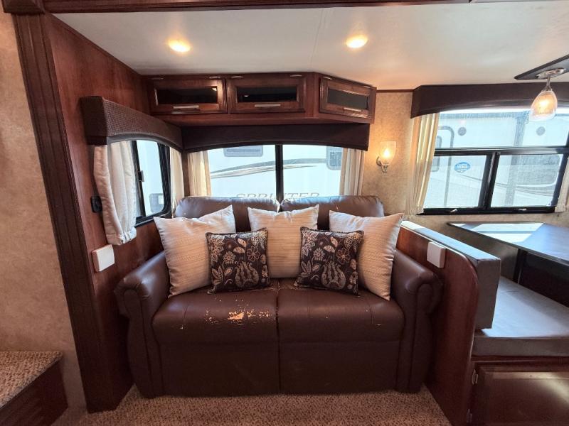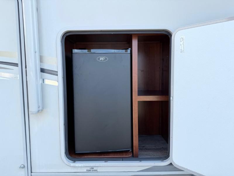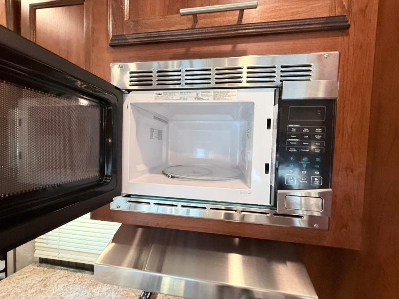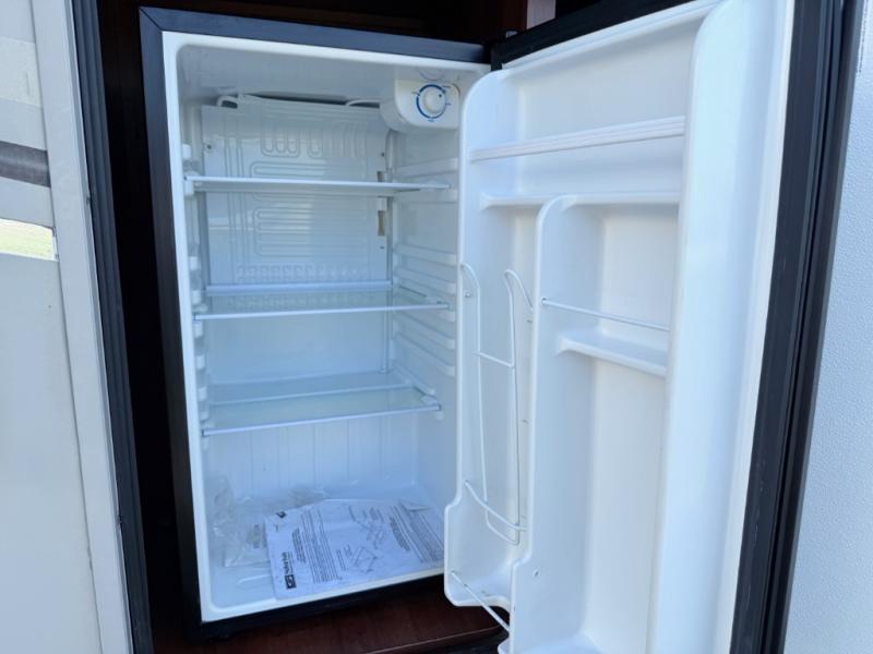 As you step inside this fifth wheel, to the left is the kitchen featuring a L-shape countertop with a double kitchen sink. Continuing along the curb side there is a three burner range, overhead microwave, refrigerator, and corner entertainment center. The opposite side of the fifth wheel has a slide with a hide-a-bed, and booth dinette or you can choose an optional free-standing table and chairs.