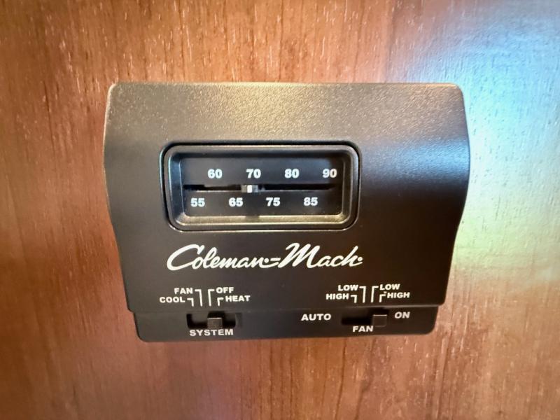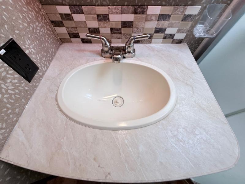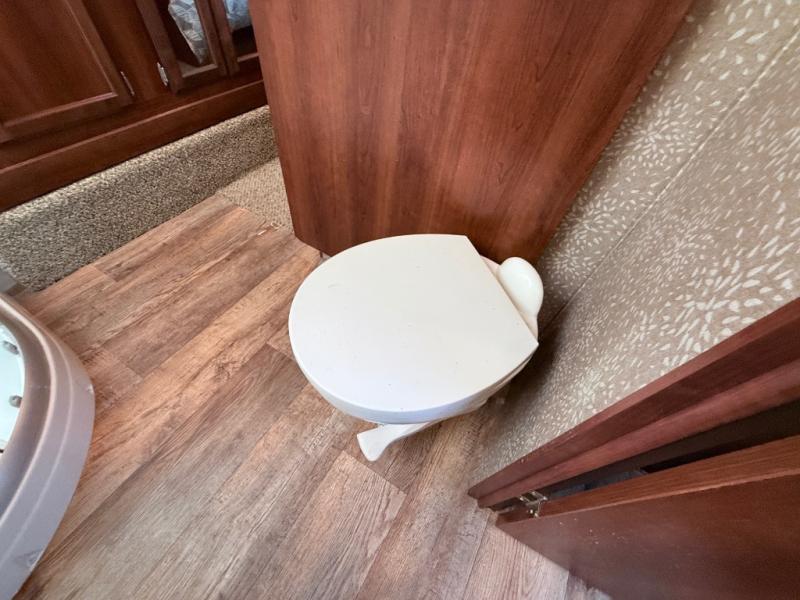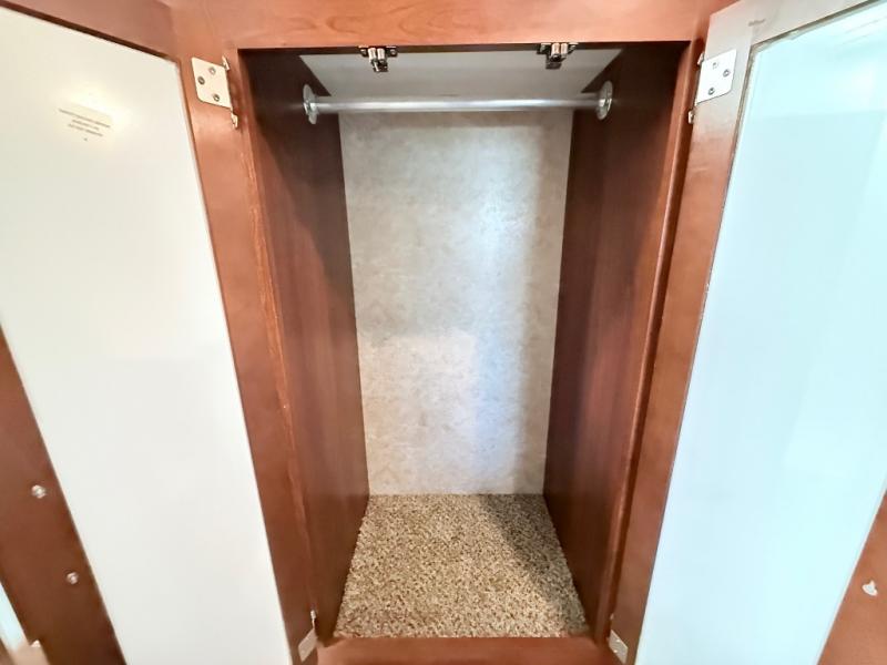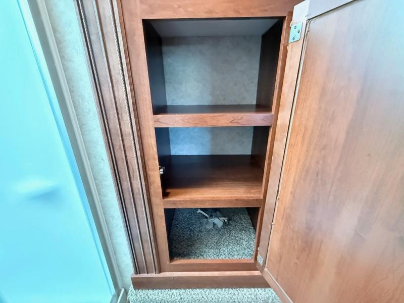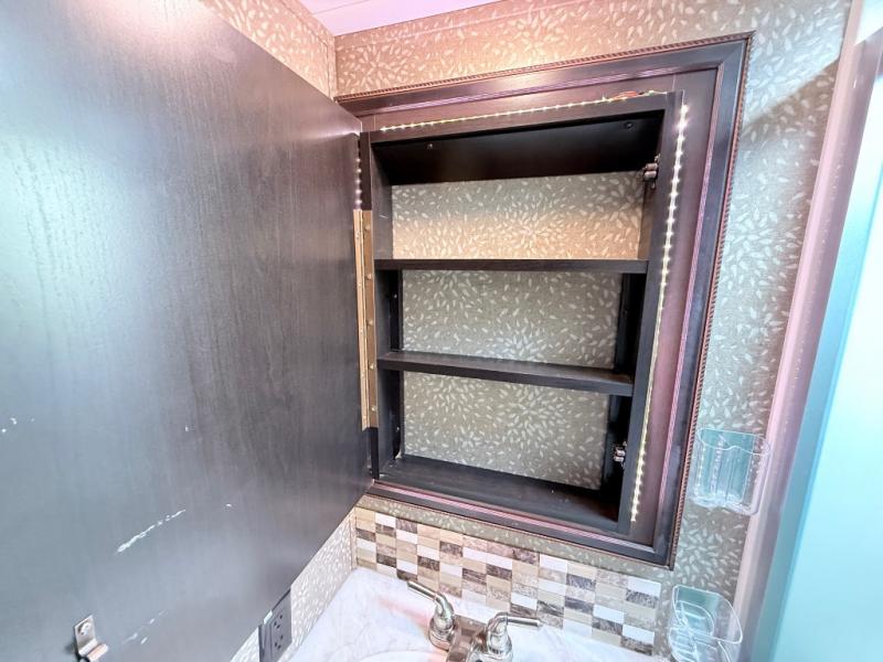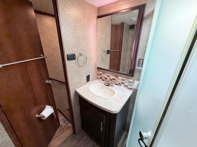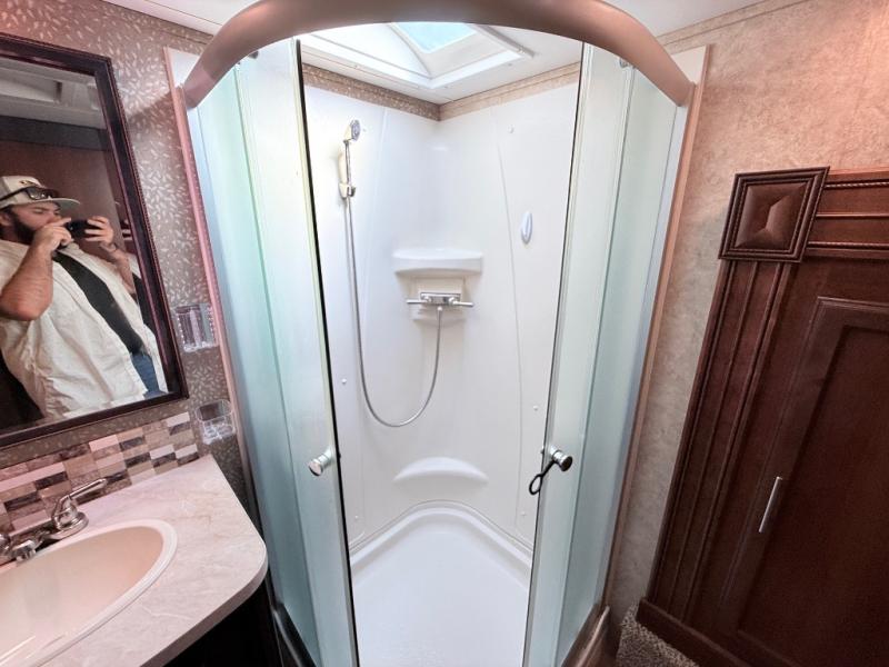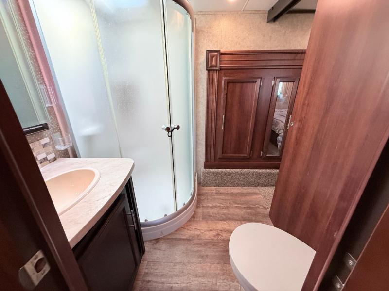 As you proceed up the stairs in the front of the fifth wheel, the bathroom is on the left side. Inside the bath you will find a sink, medicine cabinet, corner shower, toilet, and a linen cabinet which is part of the bedroom slide. There is also a private entrance into the bedroom from the bathroom.