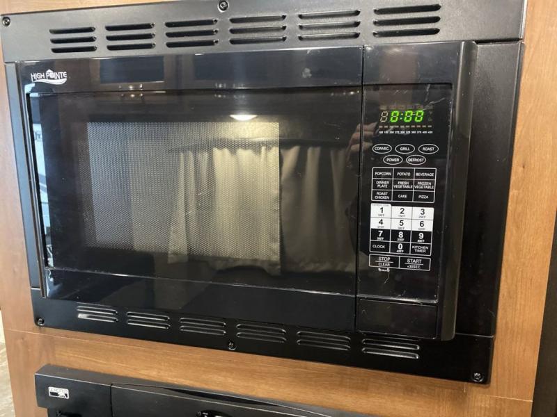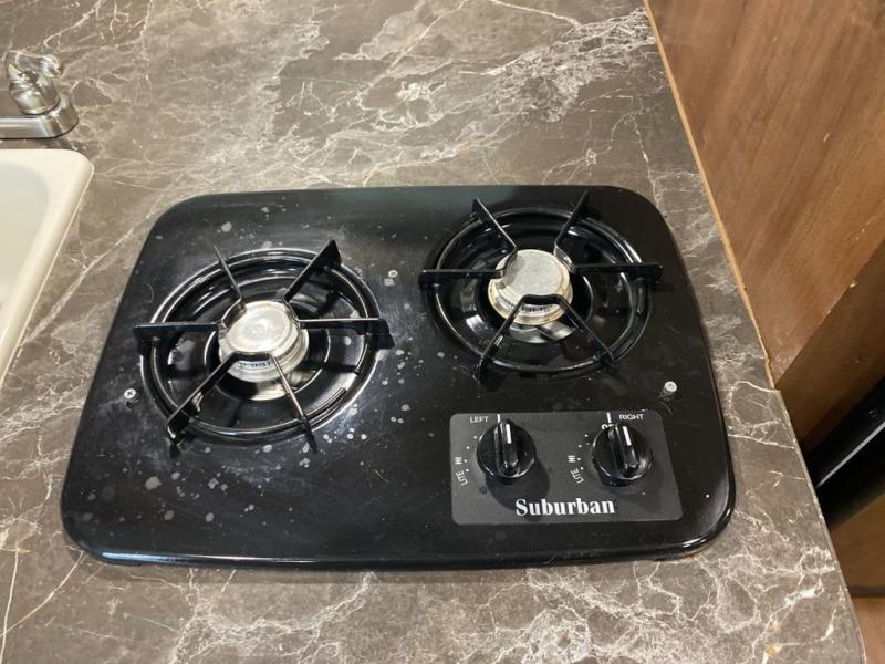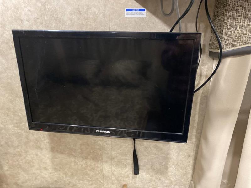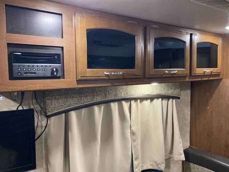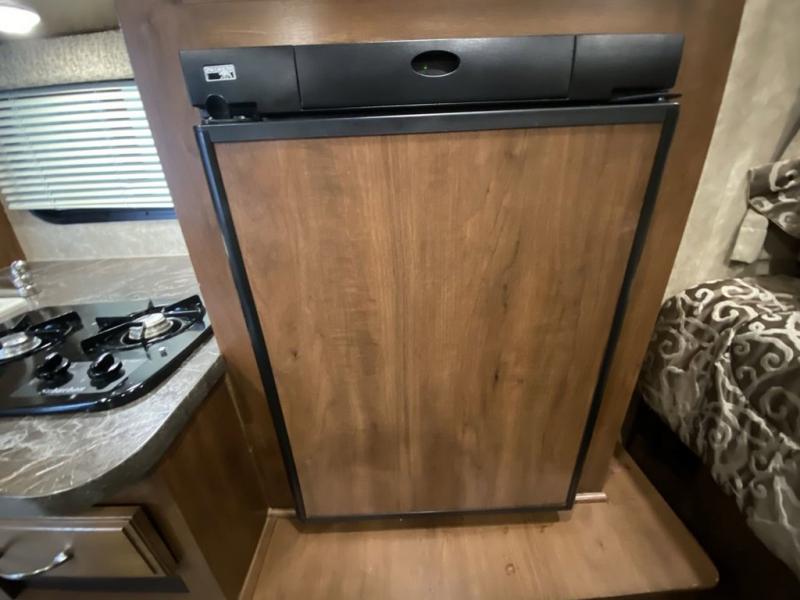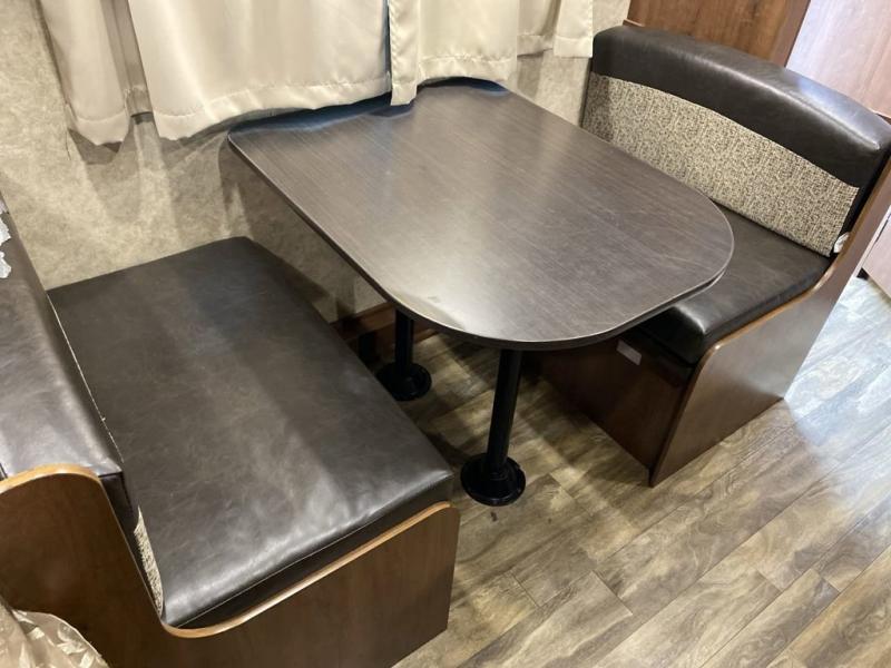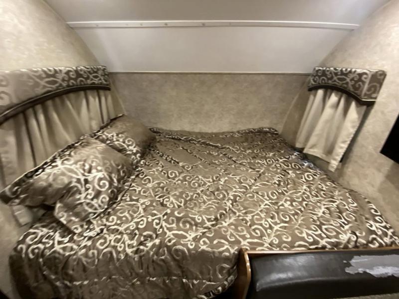 Along the wall that shares the bathroom there is a table/storage. Moving forward you will notice that the slide out has a sink, two burner range, overhead cabinet, refrigerator, and microwave. Across from the slide out there is a dinette with an overhead cabinet, and along the front of this model is where you will find the queen bed. Along the wall there is a TV which is easily viewable from the bed.
