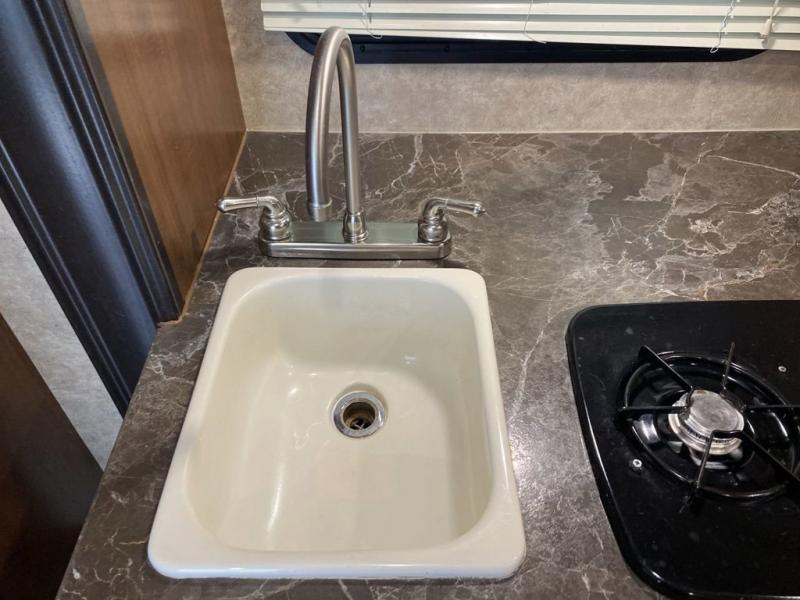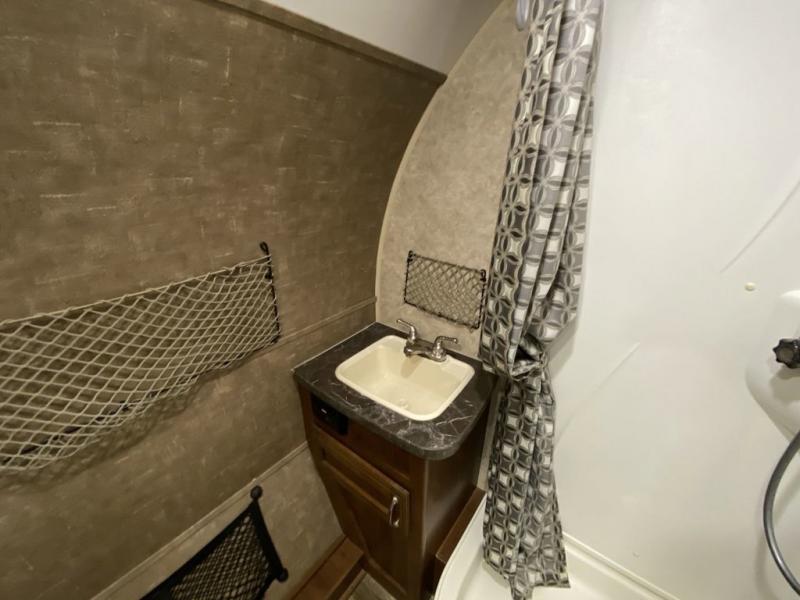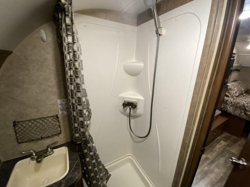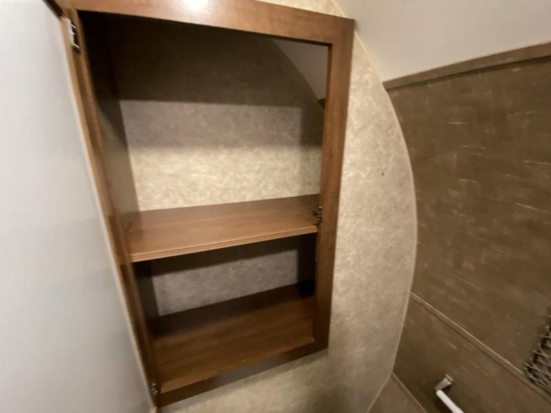 As you enter the trailer, you will find that the bathroom area runs the full width of this model. Inside the bathroom find a toilet, large linen cabinet, sink, and corner shower.