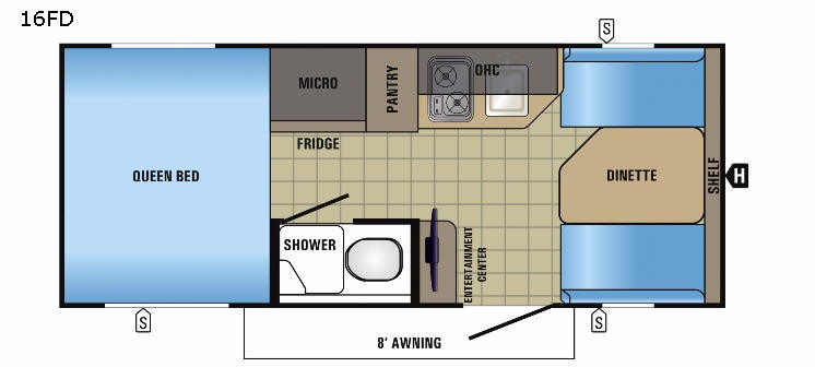 Step inside and notice the booth dinette across the front where you can easily enjoy your meals or games. There is a shelf overhead for storage. This can also be used for sleeping with the table folded down for one adult or two children. With the entertainment center to the left of the door facing the dinette you have a great spot to catch your favorite show, or news programs.