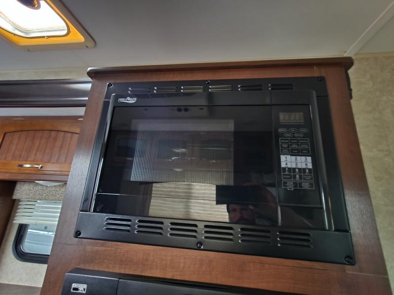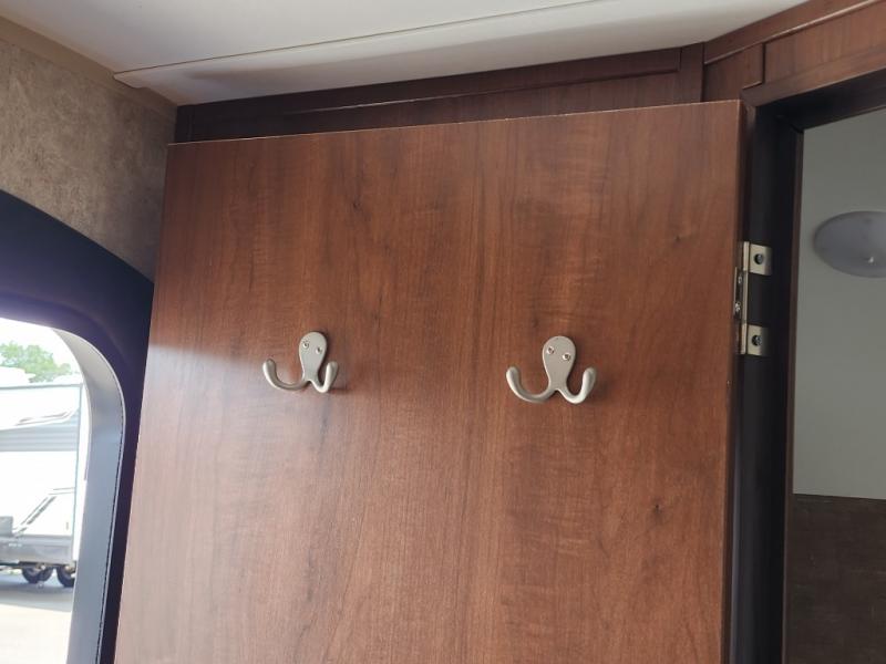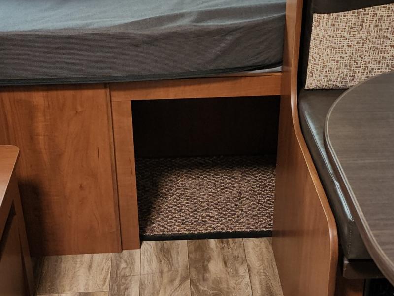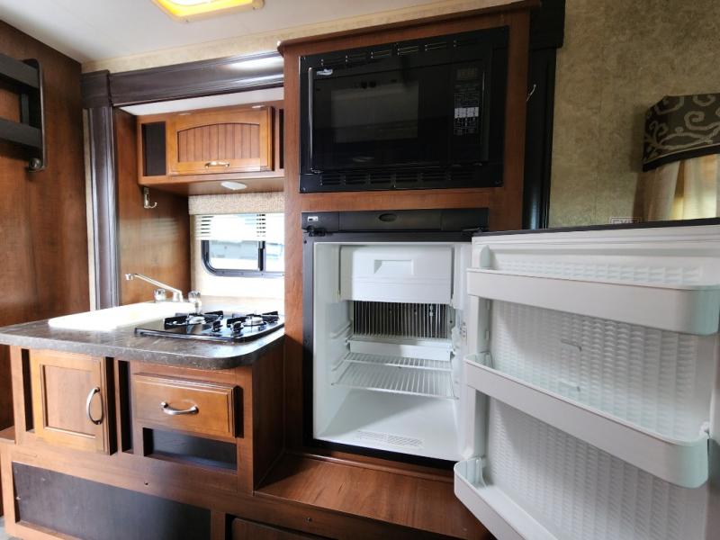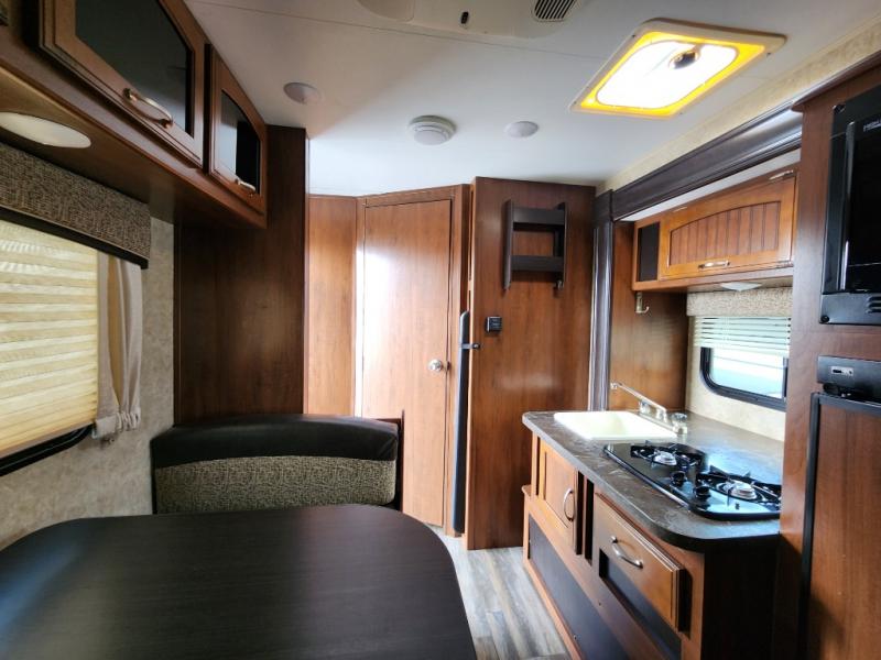 Along the wall that shares the bathroom there is a table/storage. Moving forward you will notice that the slide out has a sink, two burner range, overhead cabinet, refrigerator, and microwave. Across from the slide out there is a dinette with an overhead cabinet, and along the front of this model is where you will find the queen bed. Along the wall there is a TV which is easily viewable from the bed.