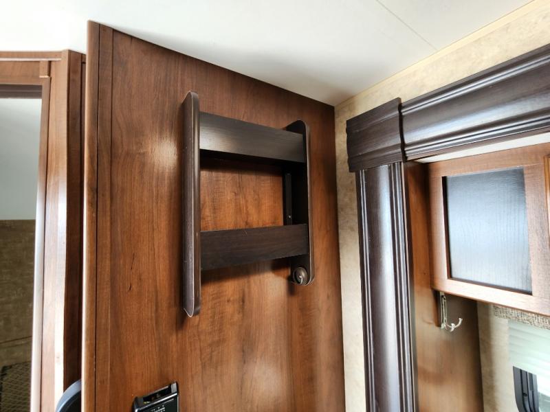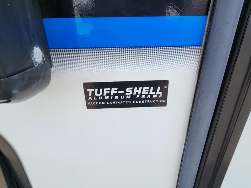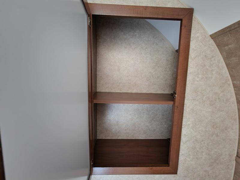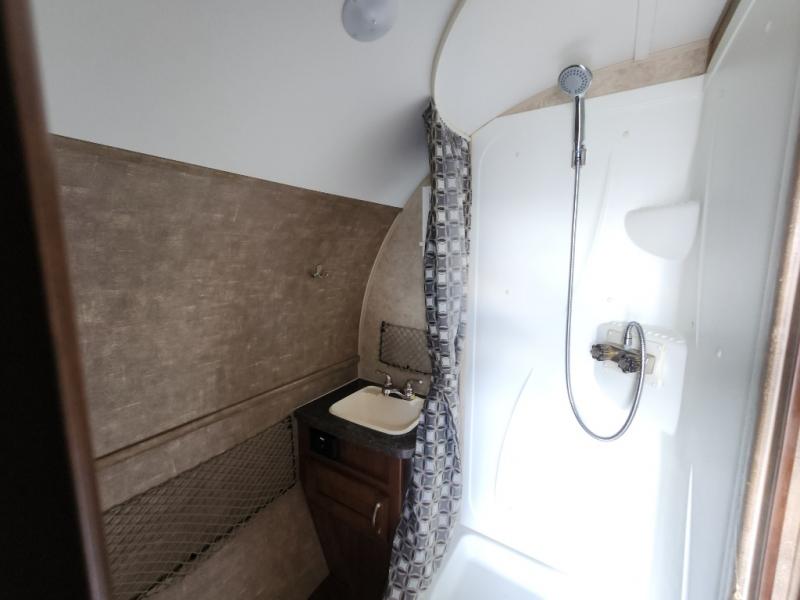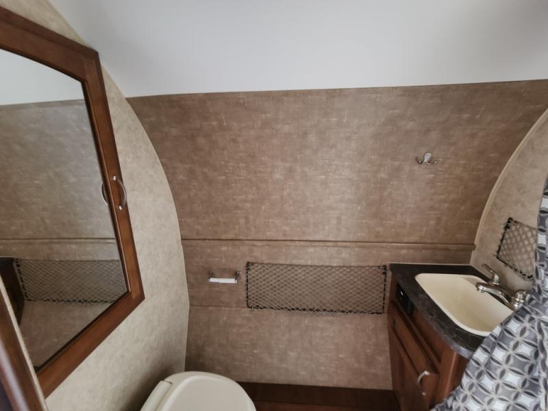 As you enter the trailer, you will find that the bathroom area runs the full width of this model. Inside the bathroom find a toilet, large linen cabinet, sink, and corner shower.