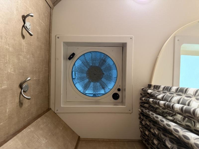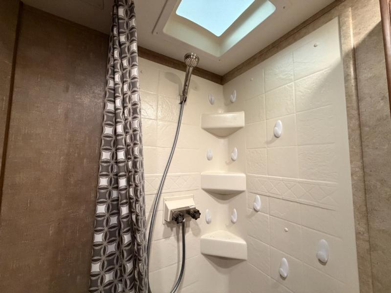 The bathroom is located in the rear, and has a toilet, a corner shower, and a sink.